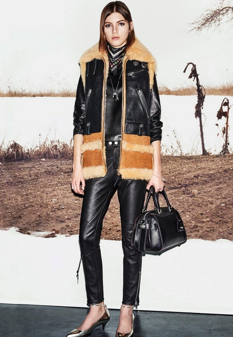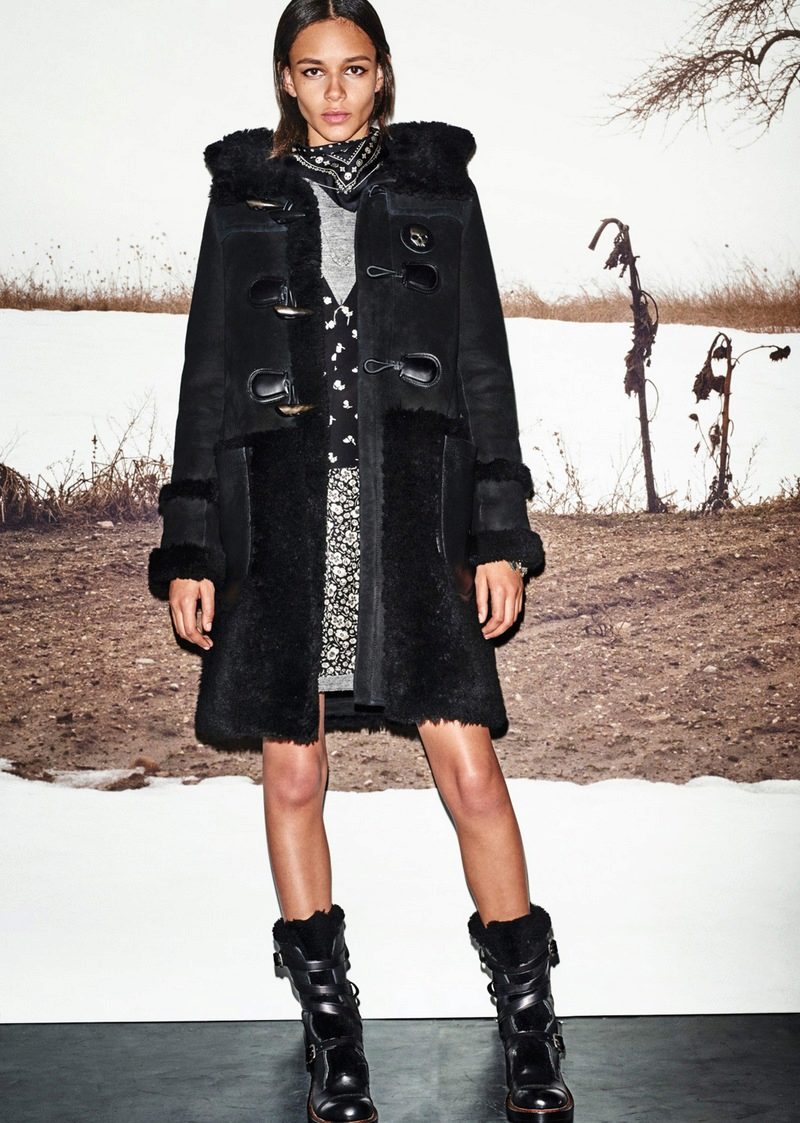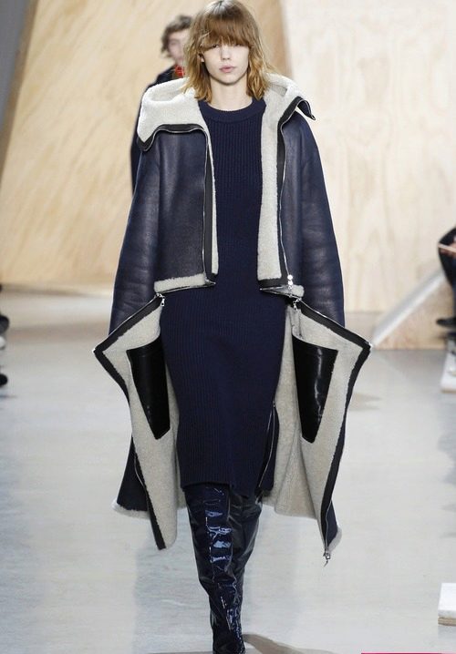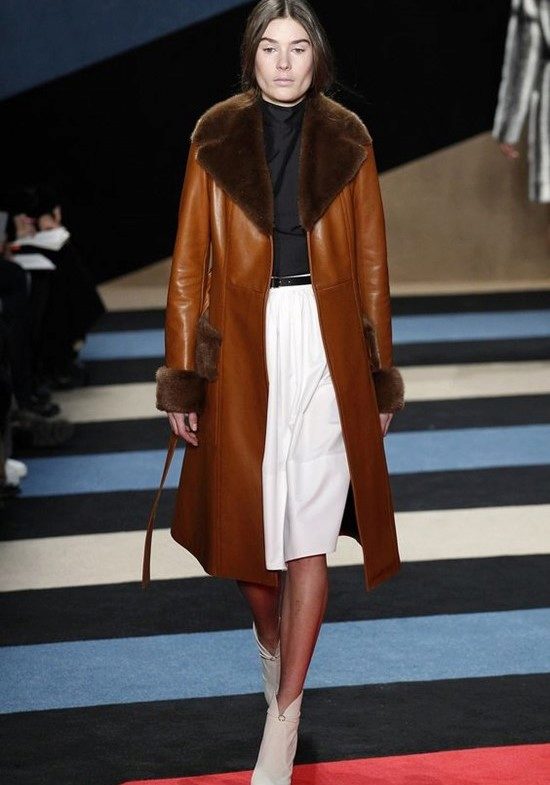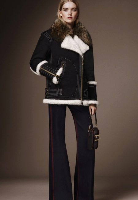 A warm-looking black sheepskin coat in military style from Burberry is an excellent example of the fact that the combination of black and white is always in fashion, and contrast stitching and high cuffs with zippers only add elegance.