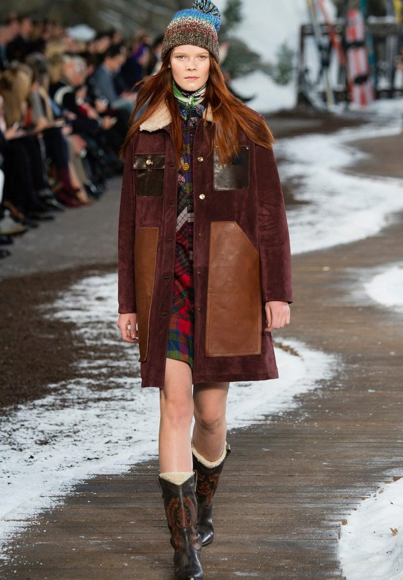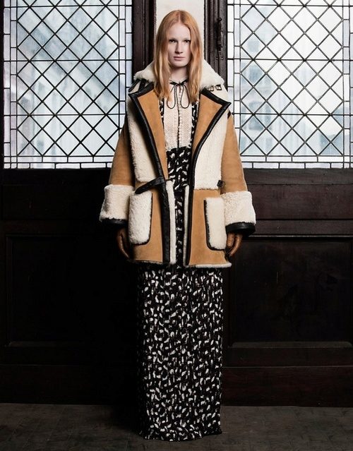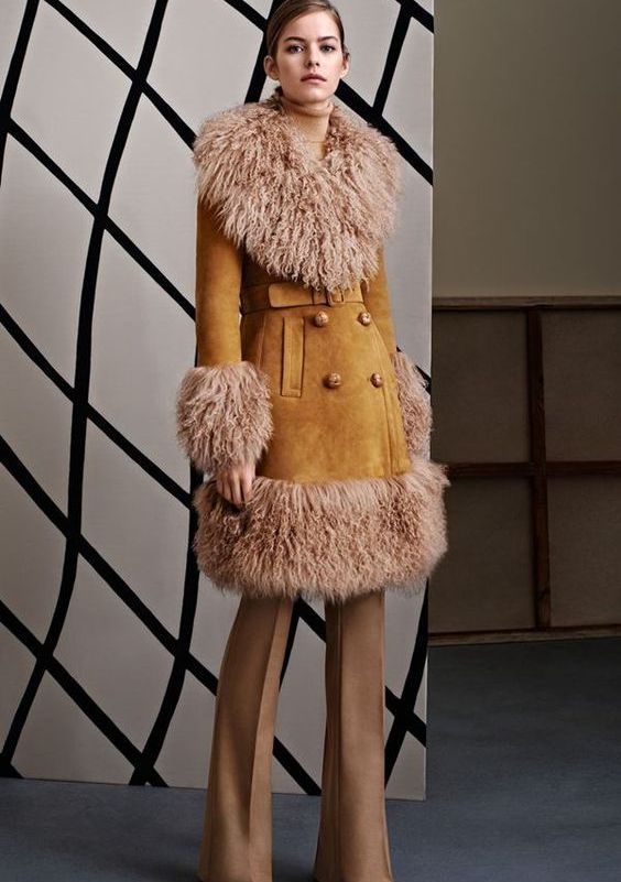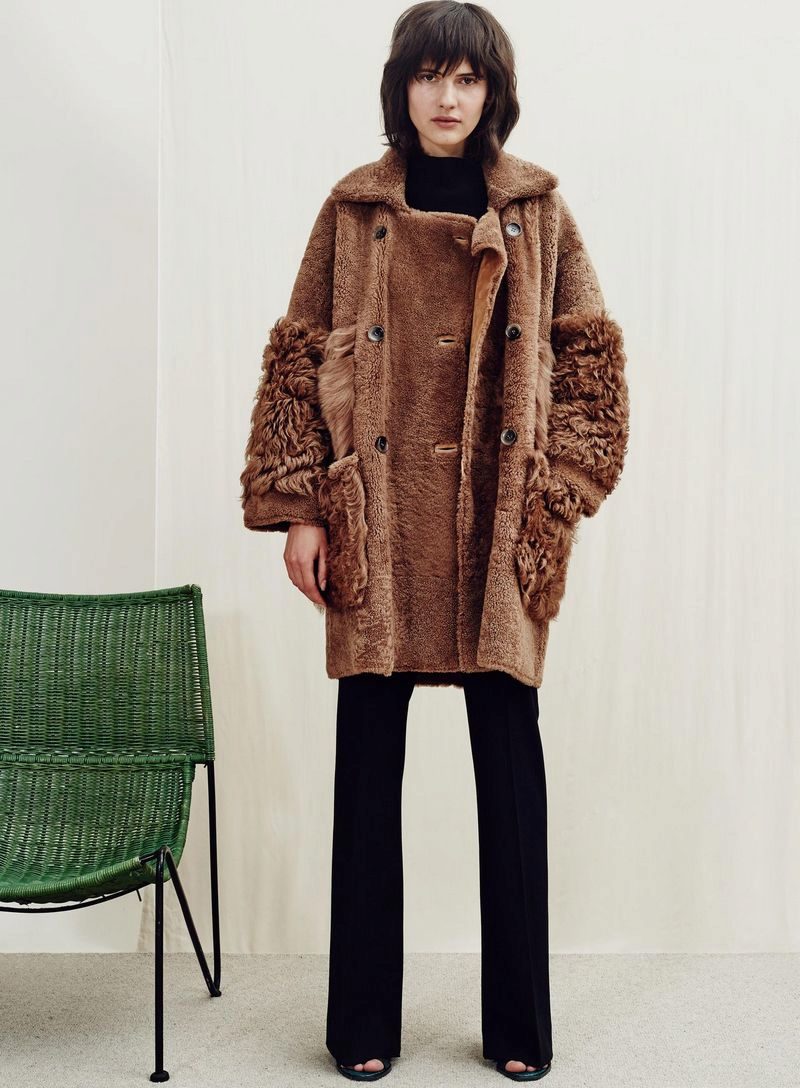 The elegant “girlish” version is a red sheepskin coat from Tory Burch with fluffy curly fur trimming around the hem and cuffs.