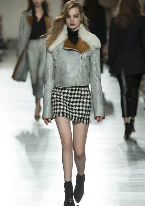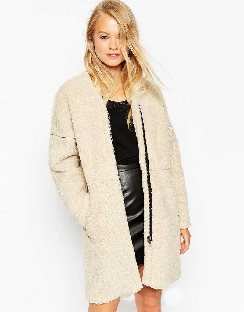 A very short gray sheepskin coat from Topshop Unique with a contrasting collar and cuffs is a great youth option.