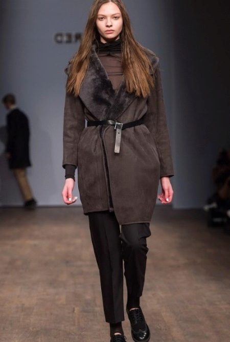 A medium-sized chocolate-colored sheepskin coat with a shawl collar and a smell on a narrow lacquer belt is a casual, but elegant option.