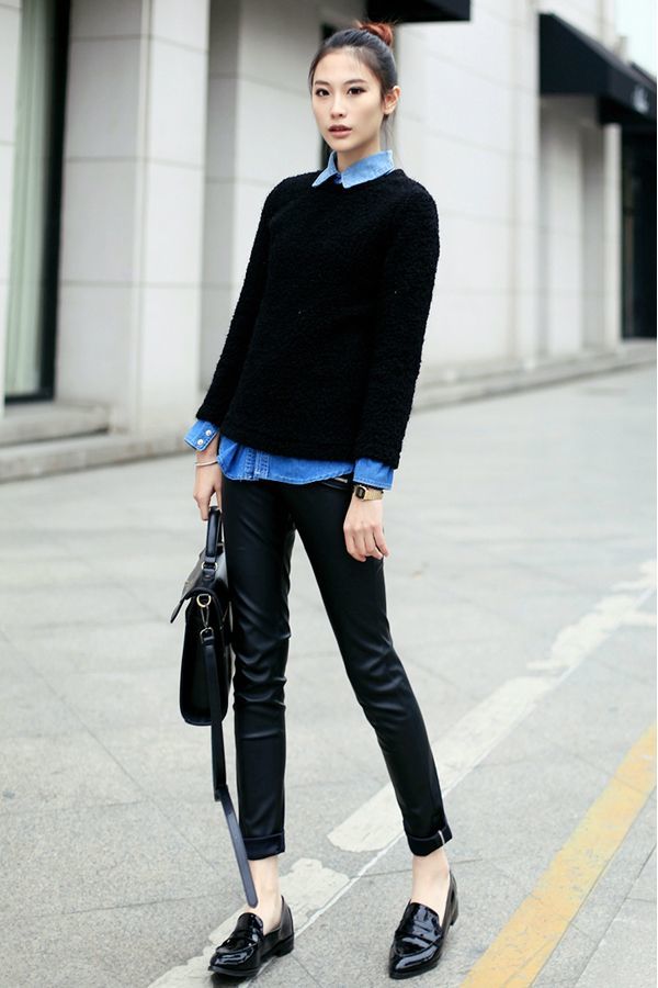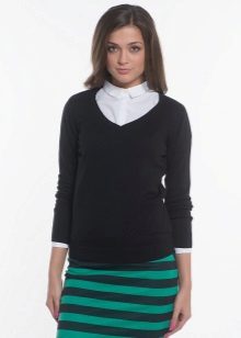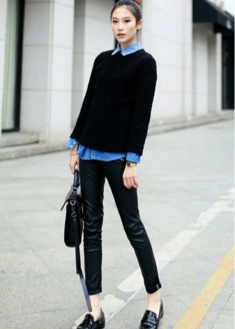 A black jumper can be worn over a shirt. Layering is a very fashionable trend. This kit is applicable both in everyday life and in the office or at school. Loafers, the so-called English style, are great for this set.
