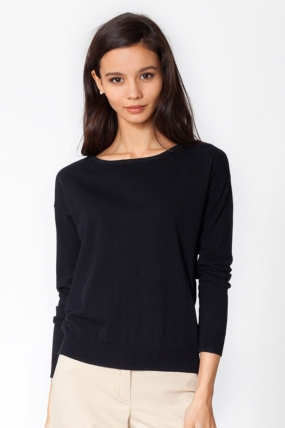 Further, an important role is played by a cutout sweater. It can be round, oval, V-shaped, “boat” or “under the throat”. All types of cutouts emphasize top volumes. Round and oval look very natural. V-neckline emphasizes the chest and visually lengthens the neck.