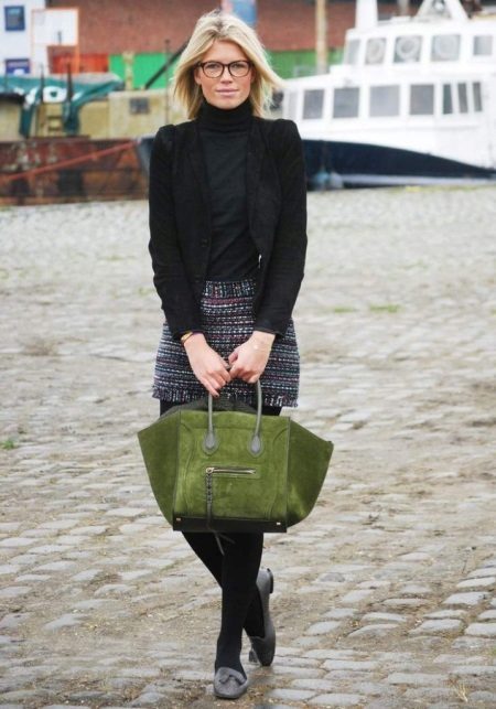 Black goes well with the monochrome things of black, gray and blue. To black did not look gloomy, dilute the image with bright accessories, take a bag of bright shade.