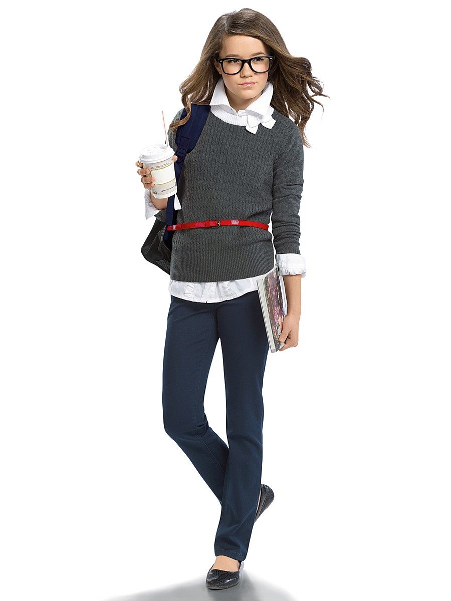 But outside the school, the choice of clothing is unlimited. Older girls are beginning to like models of elegant, “adult” colors - emerald, eggplant, mustard, wine, etc. White and black jumpers are always popular, especially in combination with a bright bottom.