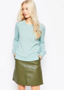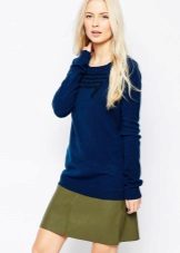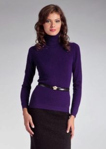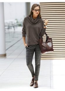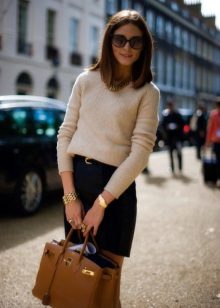 - Office option. The classic combination is a high neck sweater, pencil skirt or straight pants with arrows. Simple, but tasteful. Such a thing will give charm and elegance. To the set you can add beige pumps, a bag-briefcase, from jewelry - a neat jewelry set.