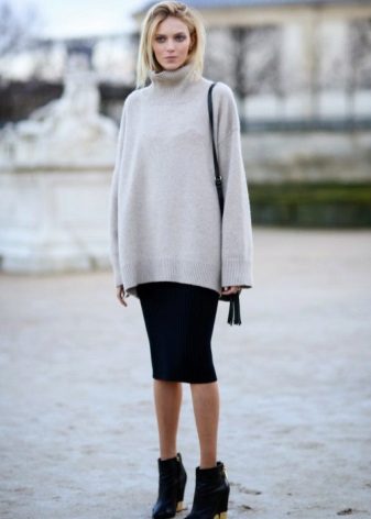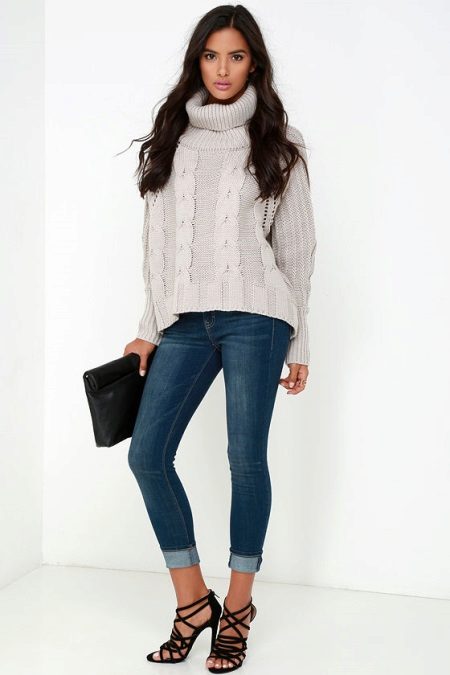 The undeniable advantage of this type of clothing is compatibility with absolutely any bottom. The sweater is good with a strict pencil skirt or with a romantic chiffon skirt of maximum length, with skinny jeans and trousers of a classic straight cut with arrows.