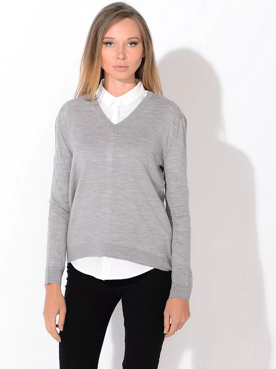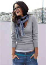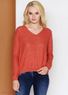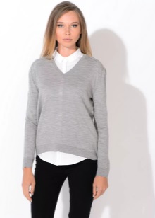 - The pullover is a semblance of a classic model with a V-neck and a lack of fasteners. This option is performed without a collar and is often decorated with an accessory - a scarf. Comfortable wearing over the head makes it a comfortable and priority item in choosing a comfortable thing to keep warm.
