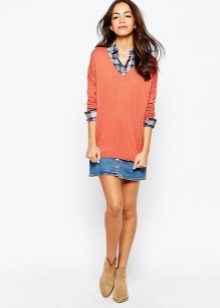 A bright orange jumper in combination with dark blue trousers is a worthy response of the approaching autumn. Bright and very attractive. In this outfit you can go anywhere - in the cinema, in a cafe, for a walk and shopping.