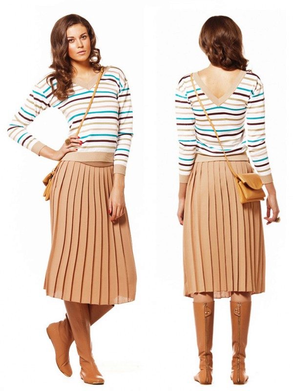 For a romantic date, fashionable women choose a cashmere sweater of delicate shades with a narrow skirt to match the top, and high-heeled shoes on the legs.