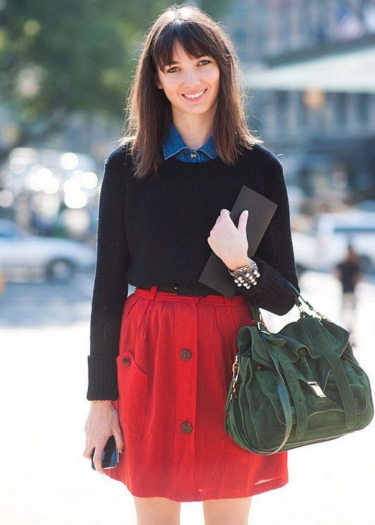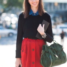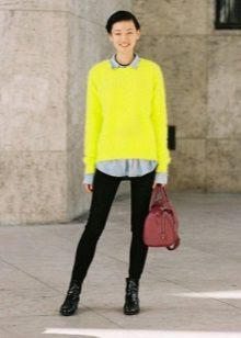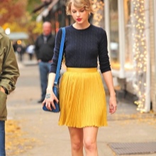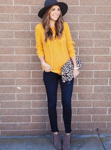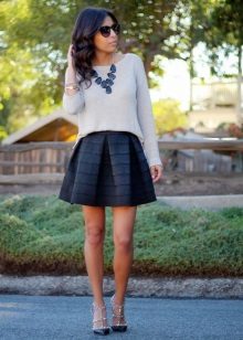 To create a creative image, the combination of a black knitted pullover with a bright skirt of styles such as the sun, in small pleats or models represented by flying silhouettes will be perfect. In this way, the skirt is a highlight, which can be accentuated with an accessory that matches the tone.