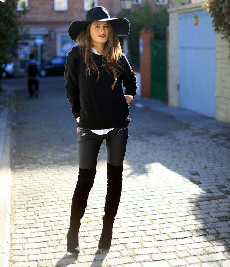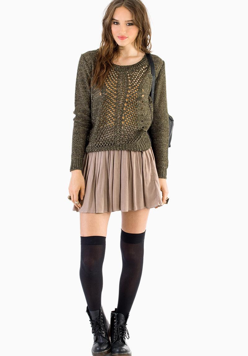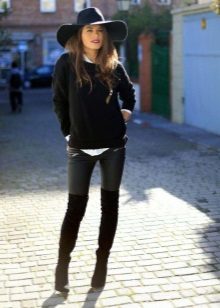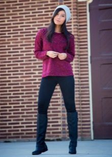 The combination of a knitted sweater of a marsh color with a skirt and a sun length mini beige color looks feminine and romantic. Such a tandem perfectly complement the leggings and boots with high tops of the same tone. Dark capacious bag will help to decorate the image.