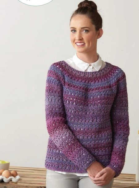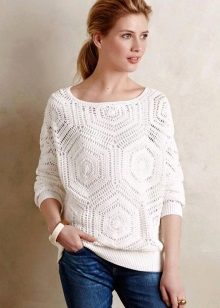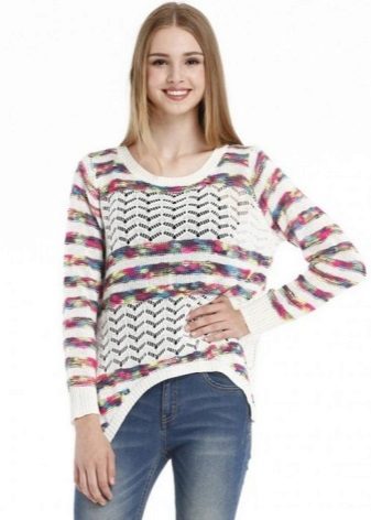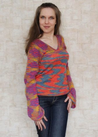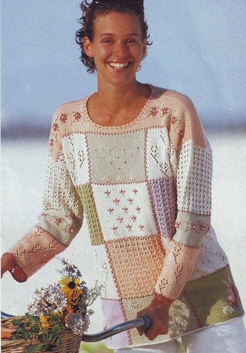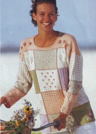 Knitted pullovers that combine several color solutions look impressive.For example, a kaleidoscope model will become a bright element of a graceful bow, which will attract the attention of others. Pullover patchwork not only combines different colors, but also a variety of knitting techniques. Such models look original and fashionable.