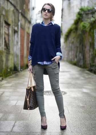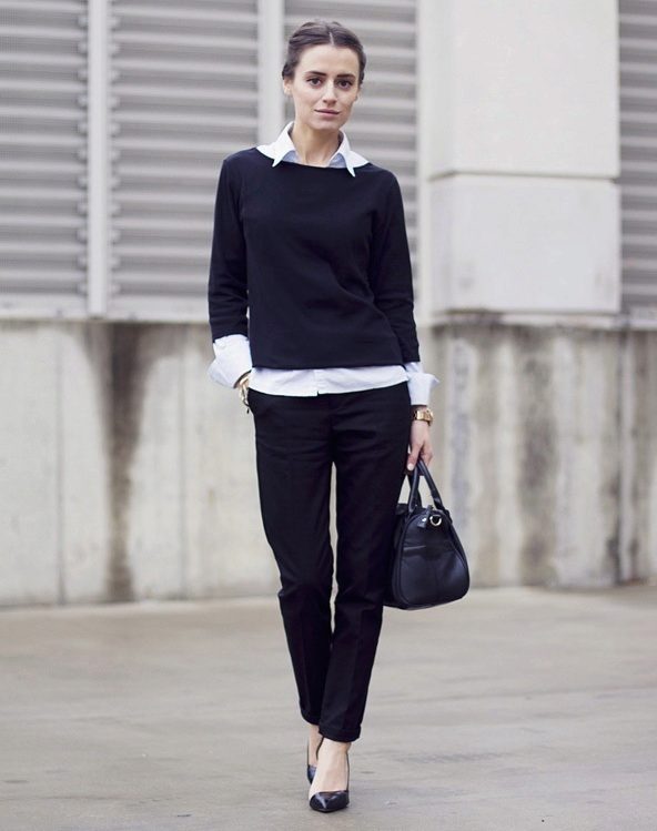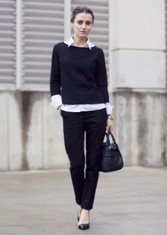 A pullover in basic tones is perfect for the embodiment of business bow. You can even pick up models with a concise print. For office style, it is worthwhile to give preference to models of a black, brown, beige or gray tone. When choosing the bottom is to wear a classic shirt of white color. To create a business ensemble, you can choose a strict skirt or straight trousers.