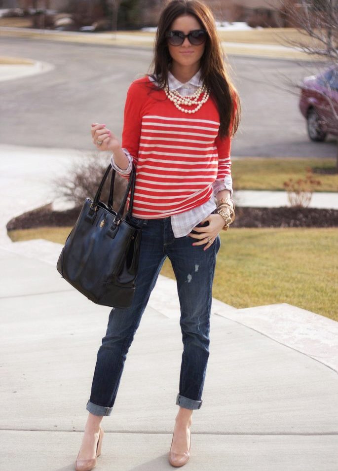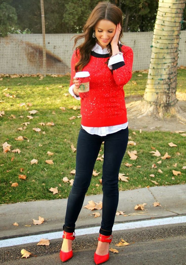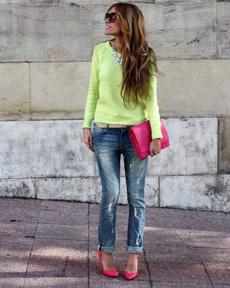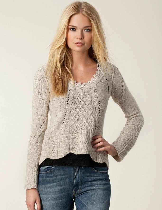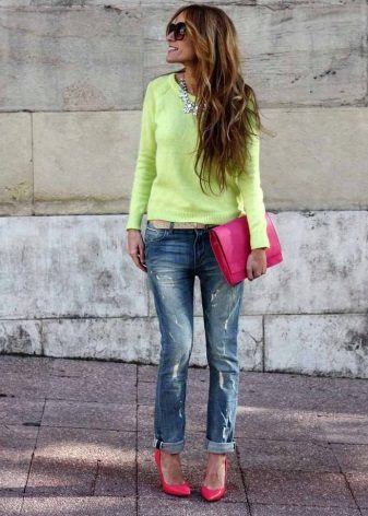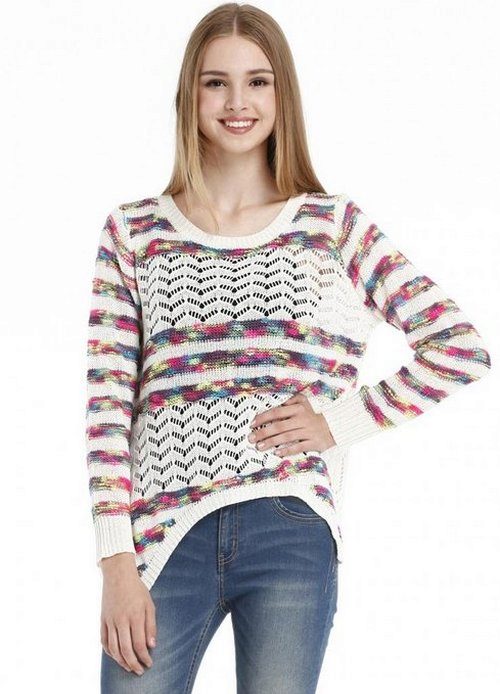 For the embodiment of the unique image for every day knitted pullover should be worn in tandem with jeans, which can be of any style. The combination of a pullover over a shirt and a denim skirt looks beautiful.