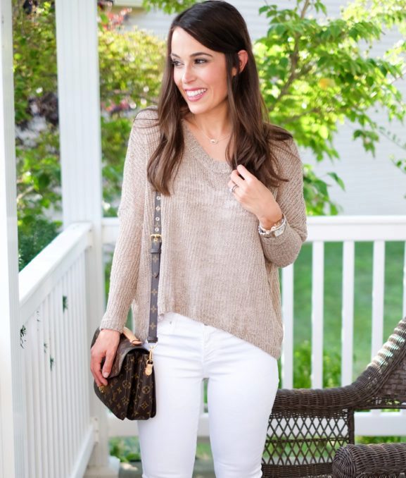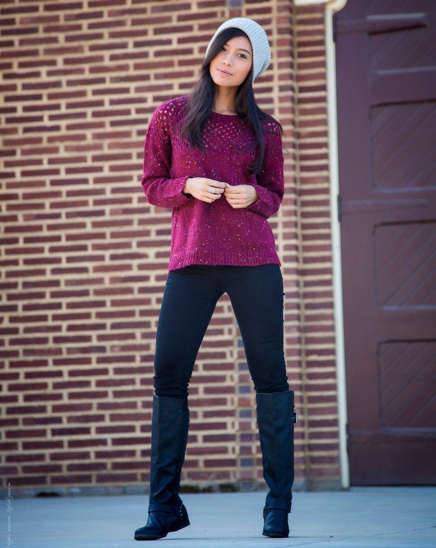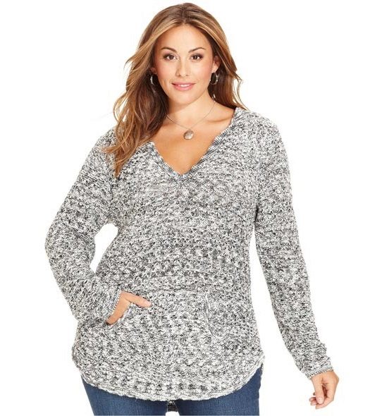 A knitted pullover with a gray hooded sweatshirt in tandem with blue jeans is perfect for everyday bow. A graceful brown belt will help emphasize the waistline.