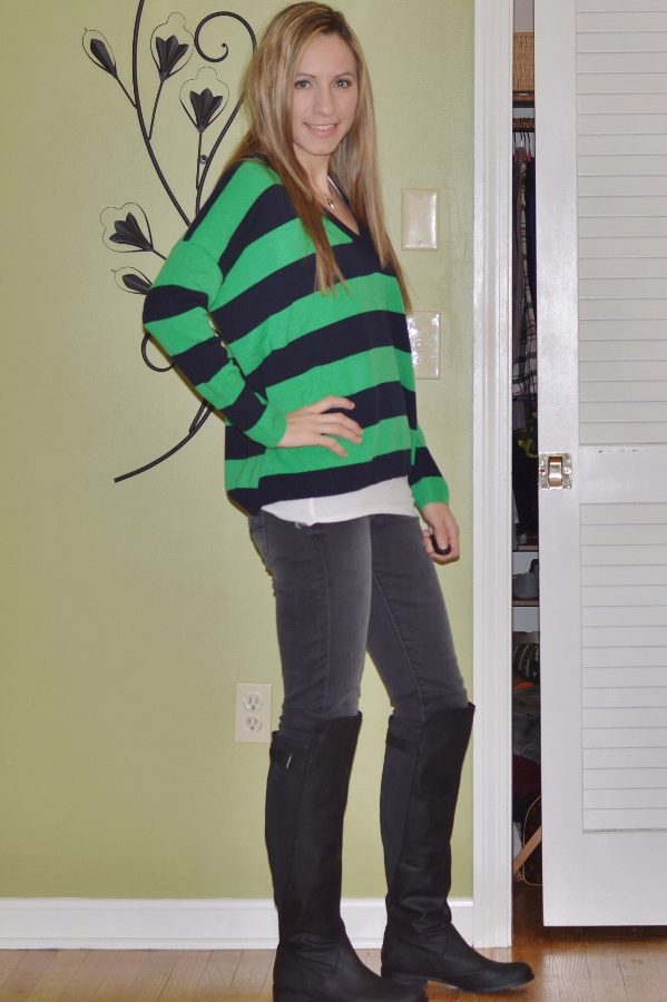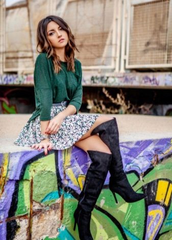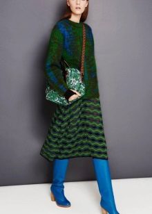 - Gray with green can be as an independent element in clothes, for example, boots, a jacket or a skirt or to be part of a green sweater in the form of stripes or rhombuses.