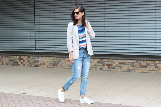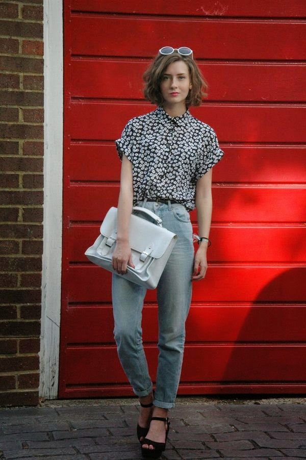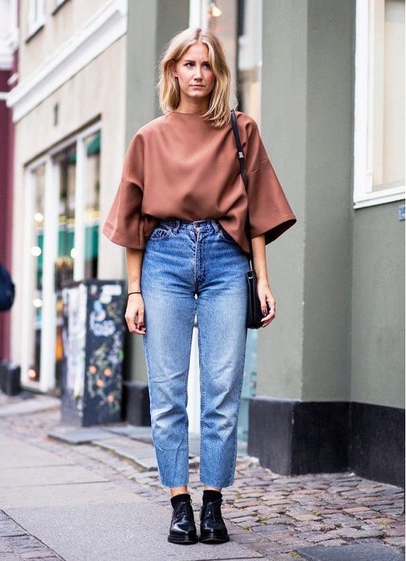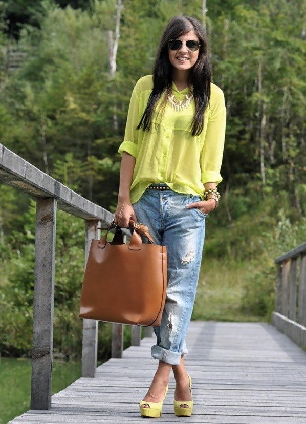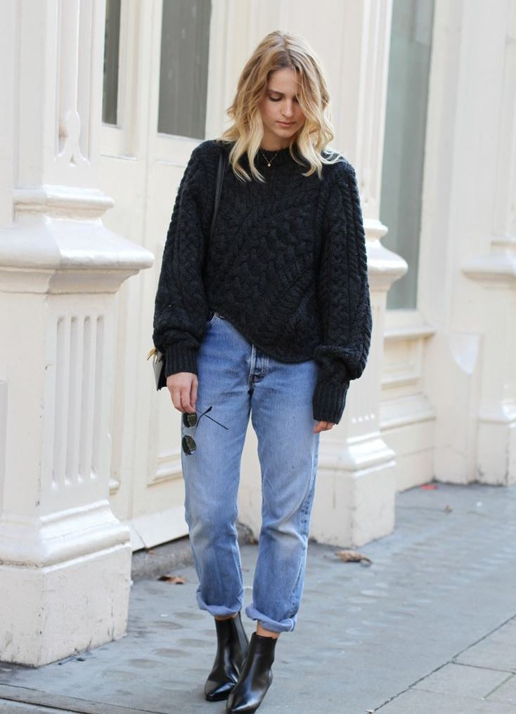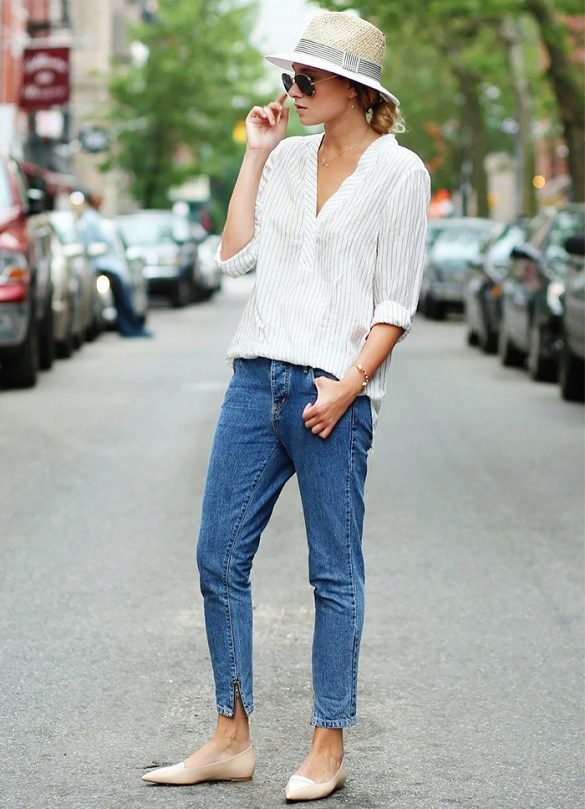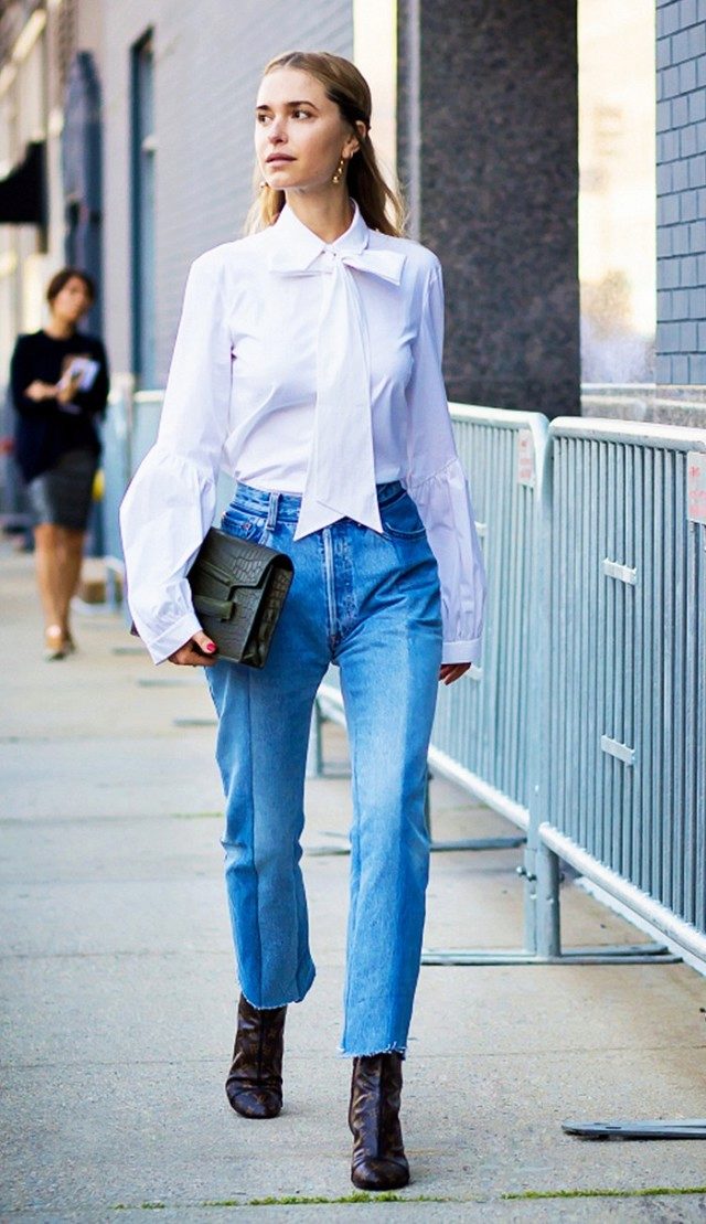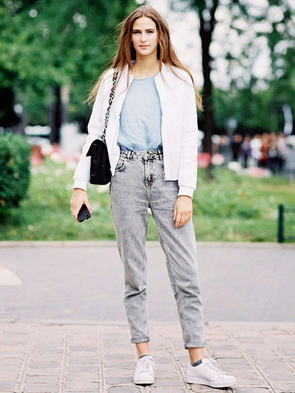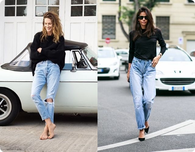 In the summer, this style of jeans can be worn with cropped tops, alcoholic T-shirts, knitwear wrestlers or hooligan t-shirts. It is worth choosing the top in casual style. But if you want to create a romantic, elegant bow, then it is better to wear a jacket, jacket or knitted raglan with American jeans.