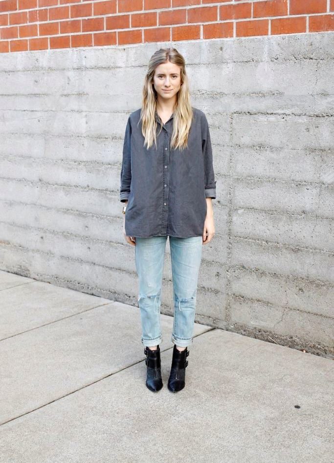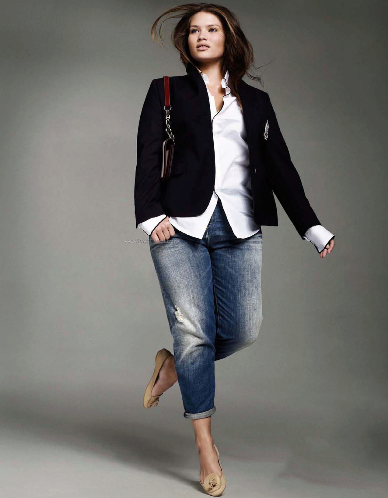 A blouse, shirt or a sweater of a free cut will help to give an image of femininity. To emphasize the waistline, the shirt should be tucked into jeans, although the tandem of American women with a shirt over it looks beautiful. When choosing a color solution, preference should be given to the top of blue or white.
