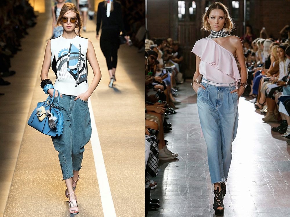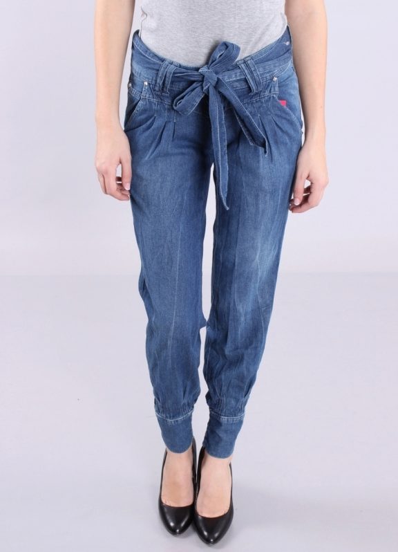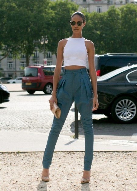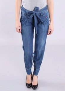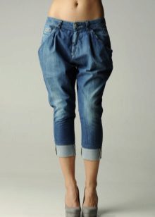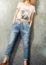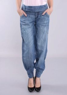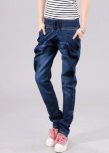 Being a prototype of the fruit of the same name, Jeans-bananas are pants, in which wide sockets are selected from the bottom cuff, strings or a gate. Landing in the classic version of this model is too high, and the fabric is collected on the belt, sometimes with a small number of folds, which, expanding at the hips, create volume on them.