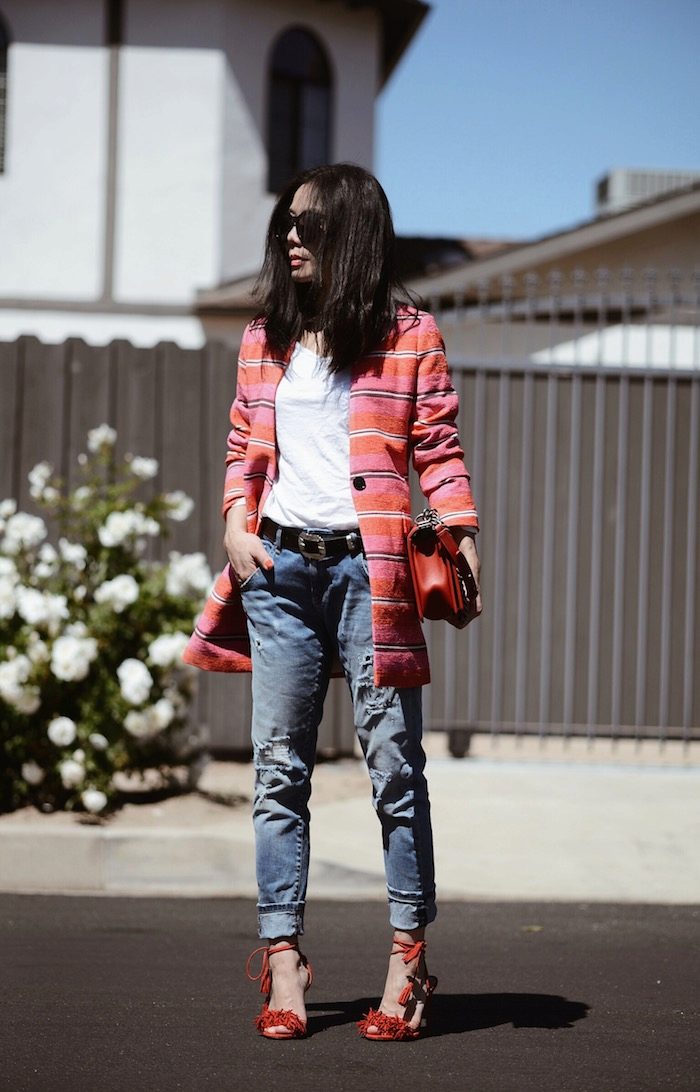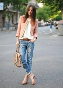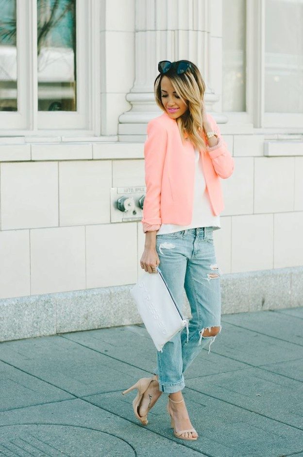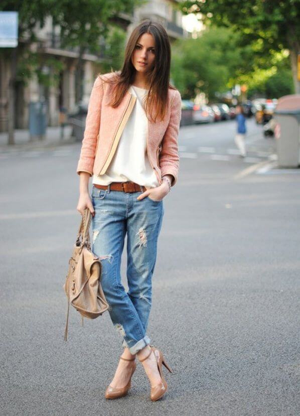 Romanticism and tenderness of this image gives the jacket a salmon color, which is an accent in appearance. A white top and tonal bag add weightlessness and cleanliness, and light-colored cropped jeans slightly complement the ensemble presented. In this set of clothes you will look great and feel confident on a romantic date or a walk.