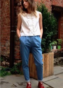 For everyday looks, jeans-bananas can be combined with a variety of tops and blouses in the summer, and during the cold season, knitted wool jumpers and even voluminous sweaters are acceptable.
