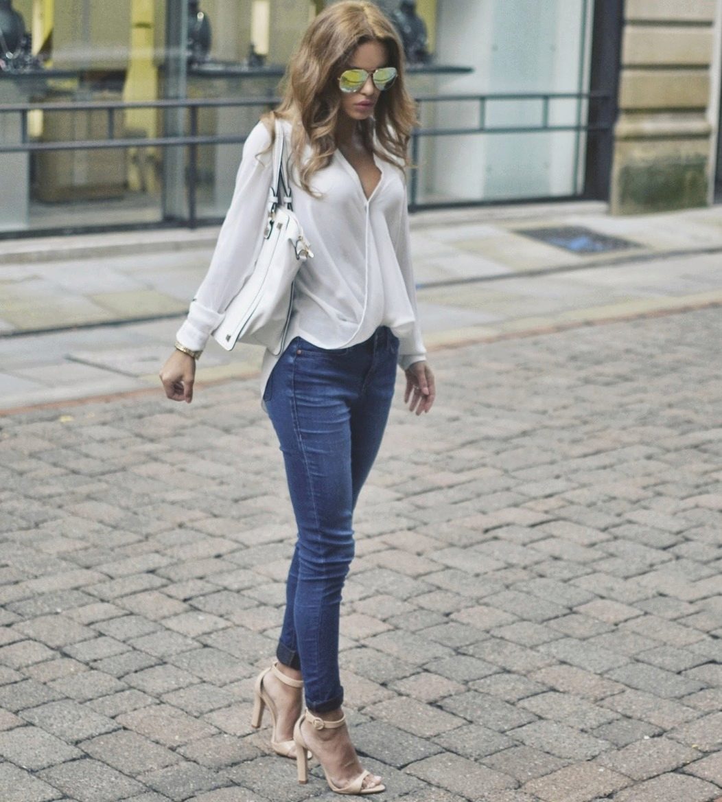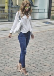 In an office bow with a white blouse, only jeans of dark colors should be combined, ideally black ones. To give more elegance to the image, you should choose models with a high waist, in which the bright top is tucked.