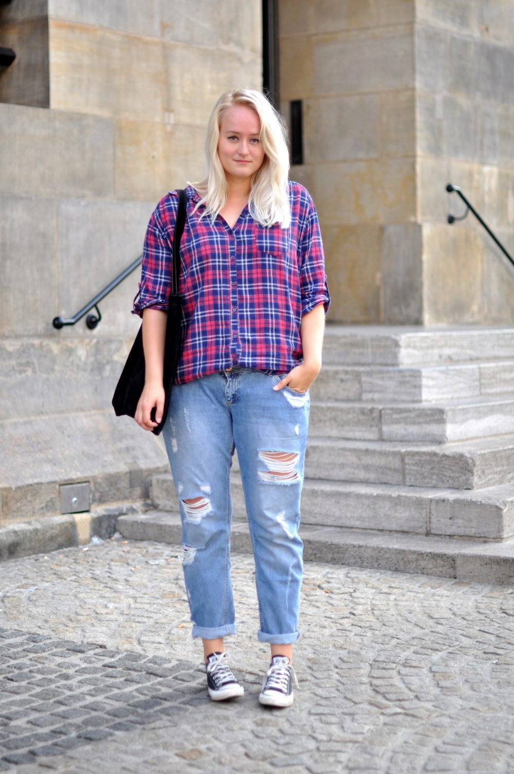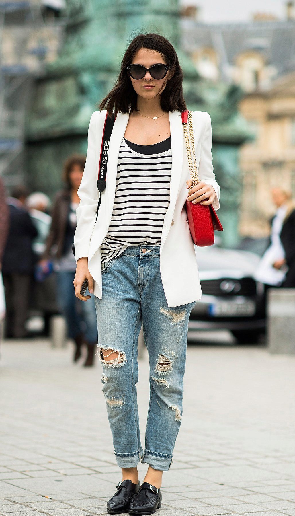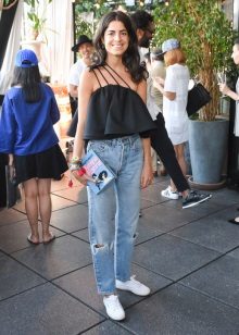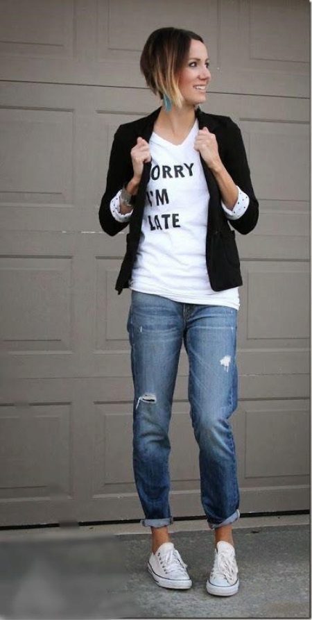 In this image, the emphasis is primarily on convenience. The combination of jeans + sneakers + T-shirt has become almost a classic in the urban trend in fashion, being an excellent option for every day for an active life, not constrained by some kind of framework.