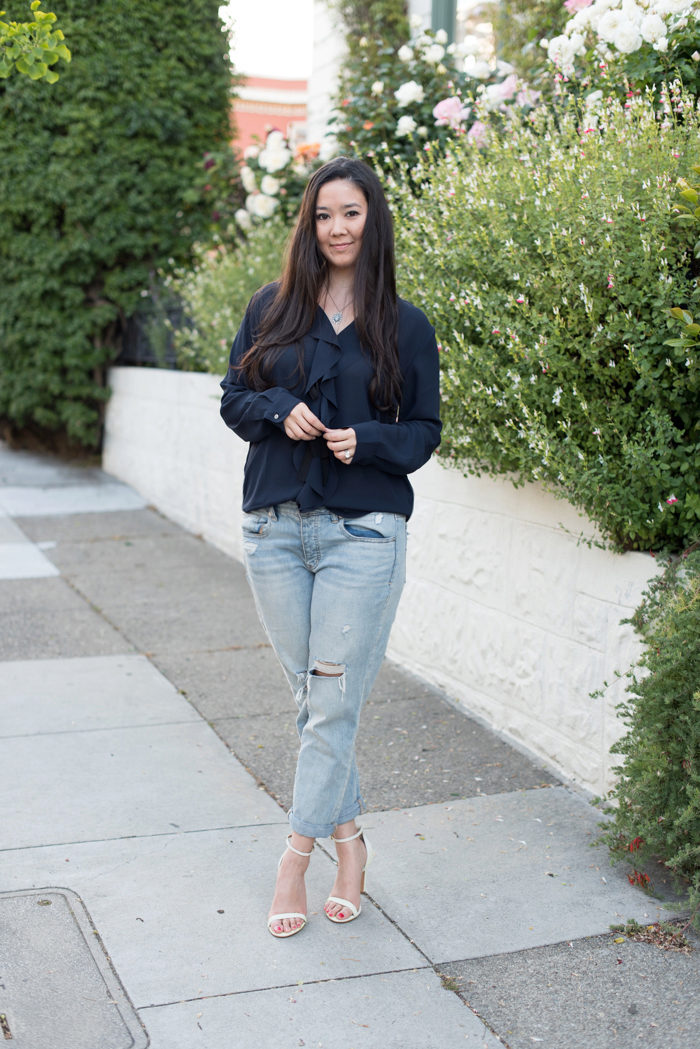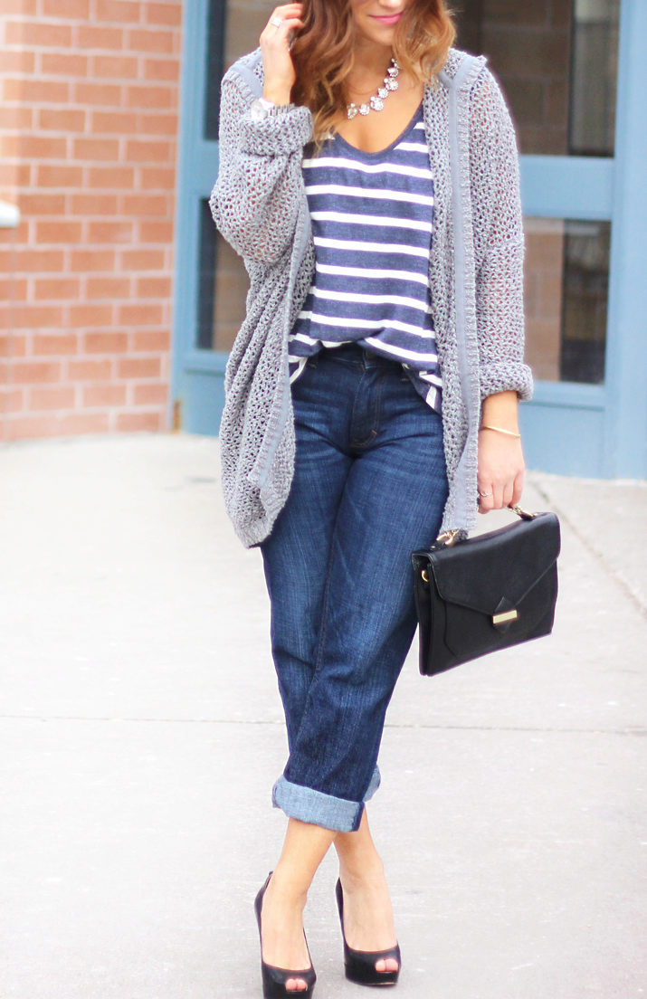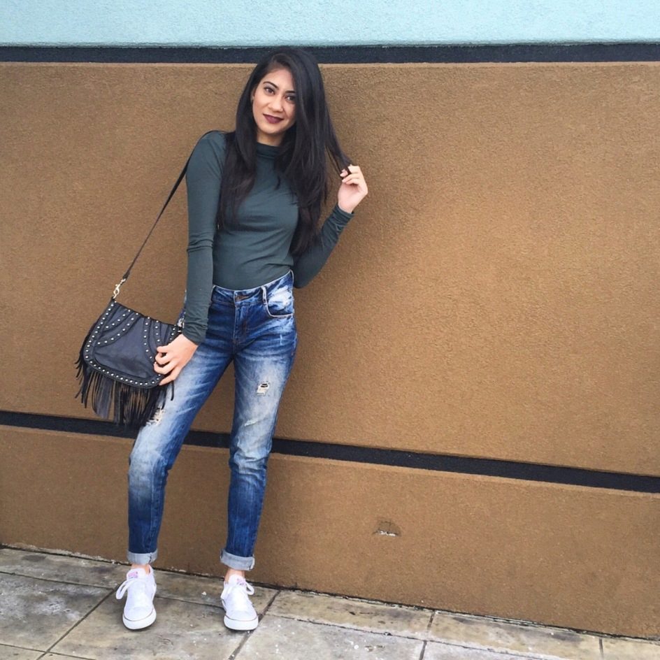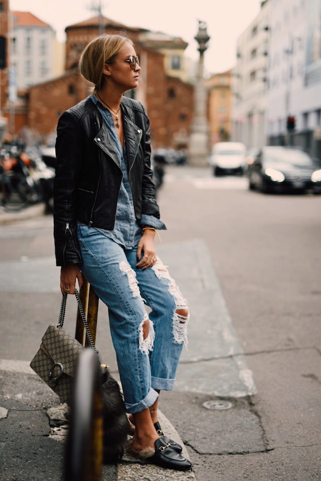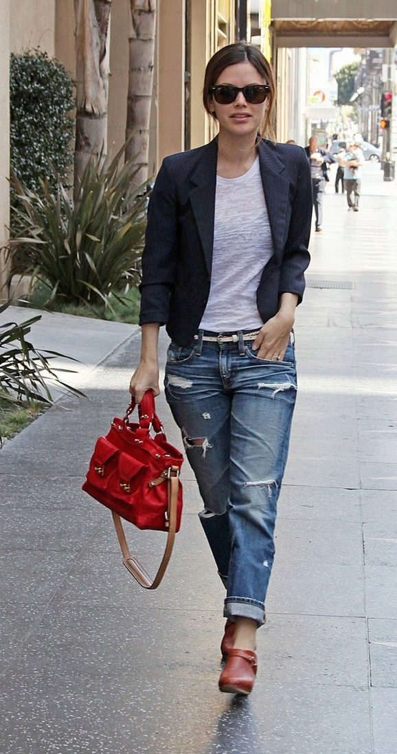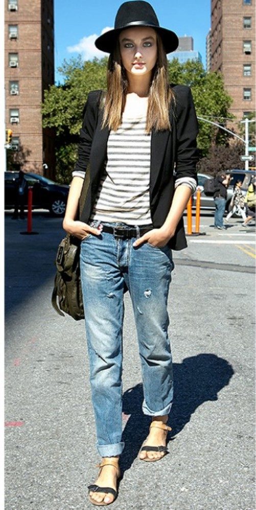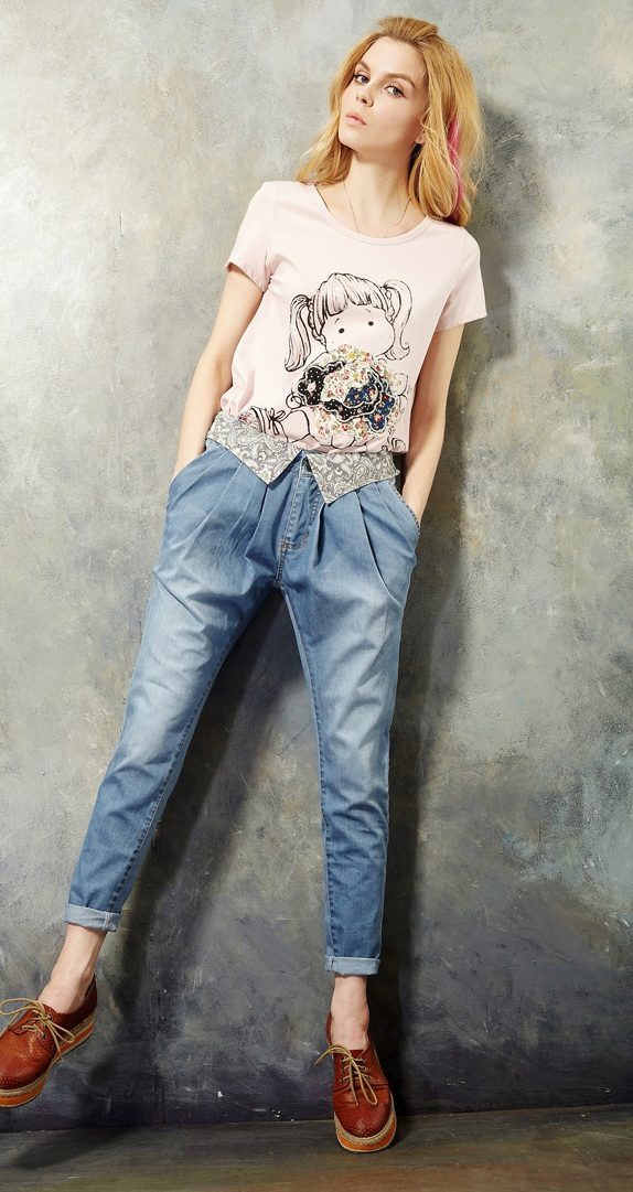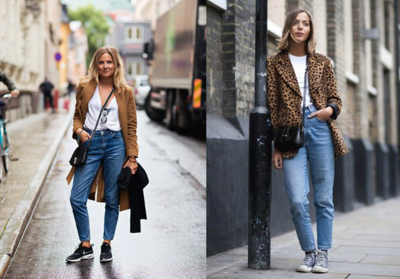 Banana jeans can be a part of great ensembles for going to a date or a romantic dinner. Wearing a light blouse with a plain print (for example, in peas), you can give your appearance a playful mood and a mischievous look. In combination with a floral patterned sweater, banana jeans will perfectly complement the image without “over-pulling” attention to yourself.