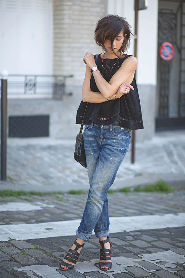 Shortened Banana jeans that barely cover the ankle are usually the summer option. For girls with high stature, such a model can be worn with shoes on a flat sole or a small platform, and owners of medium height must necessarily combine high heels with them.
