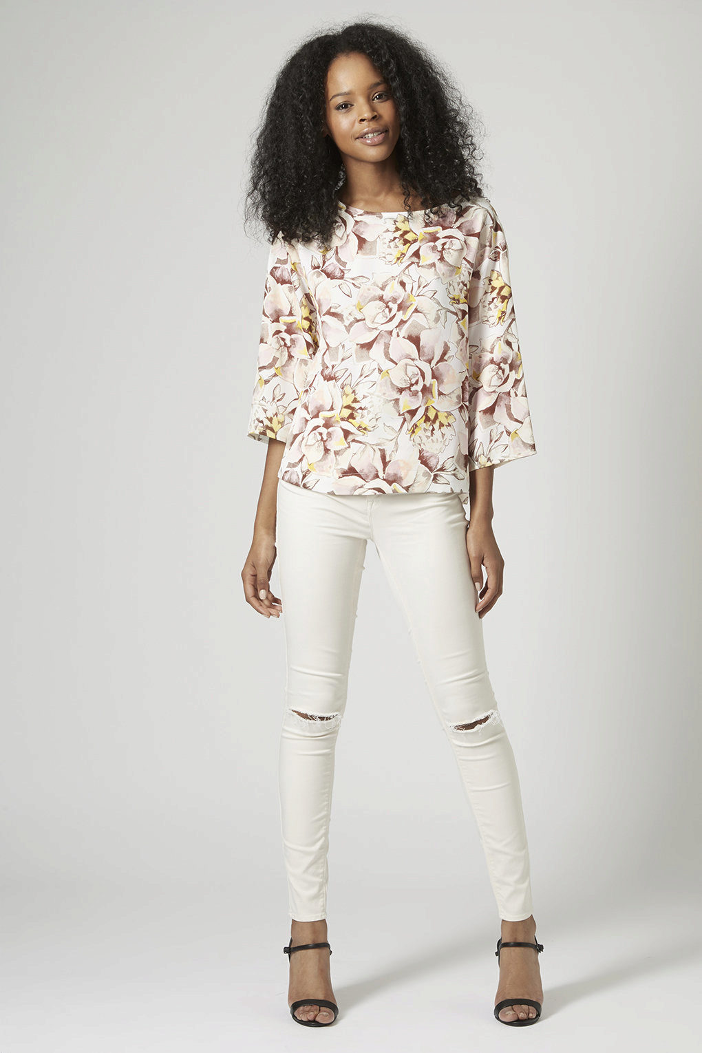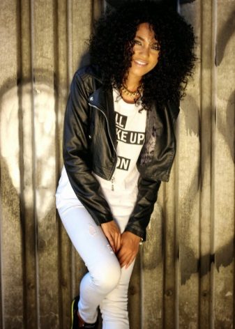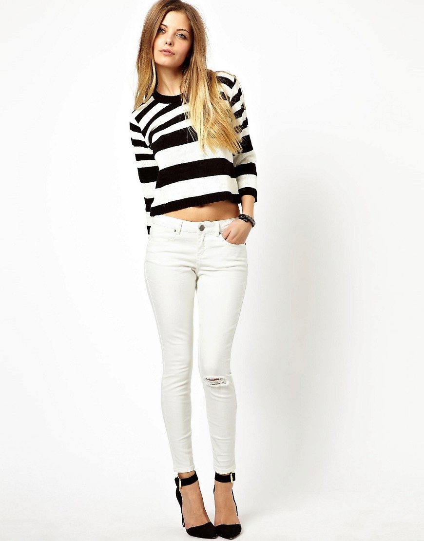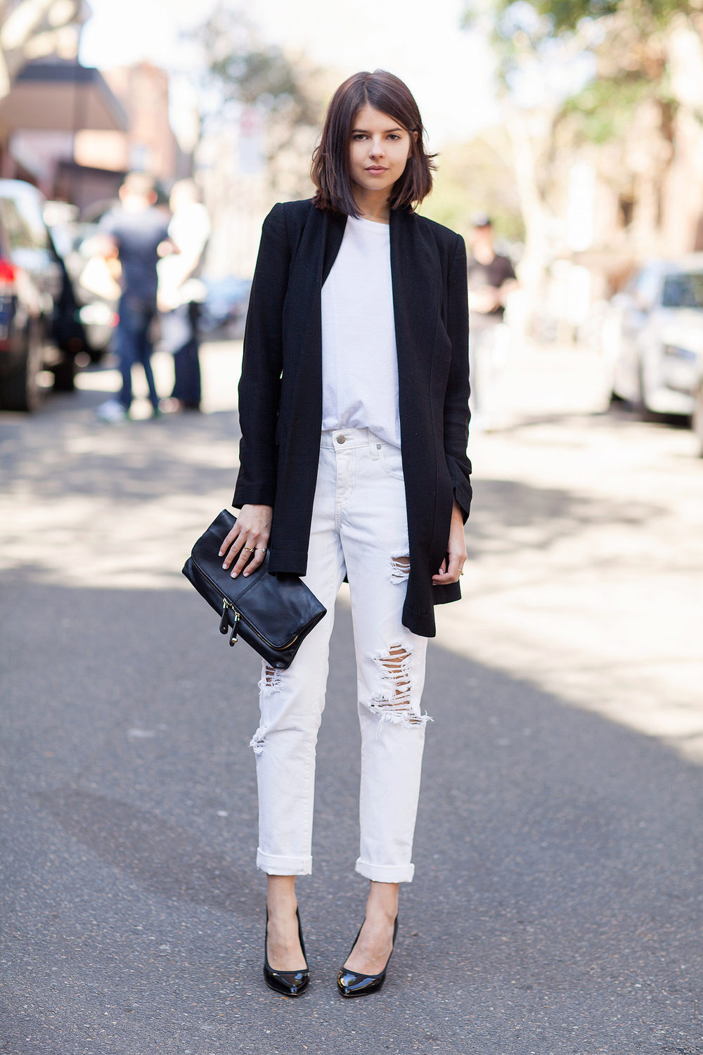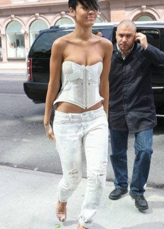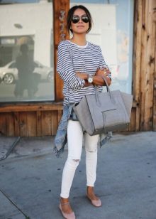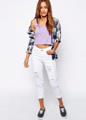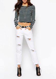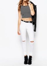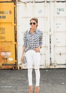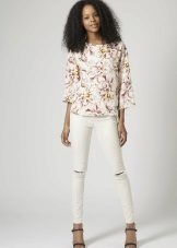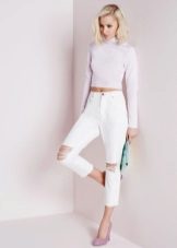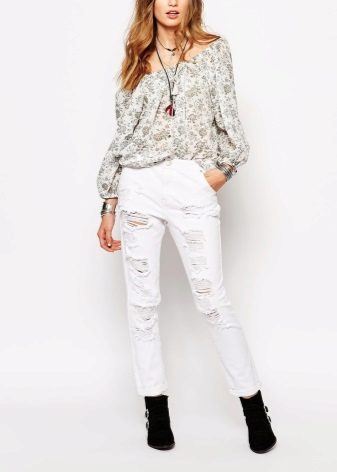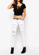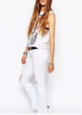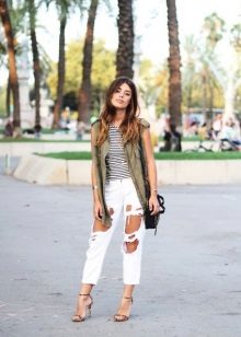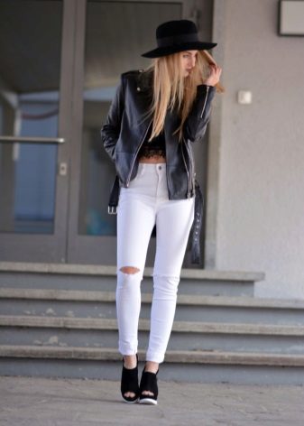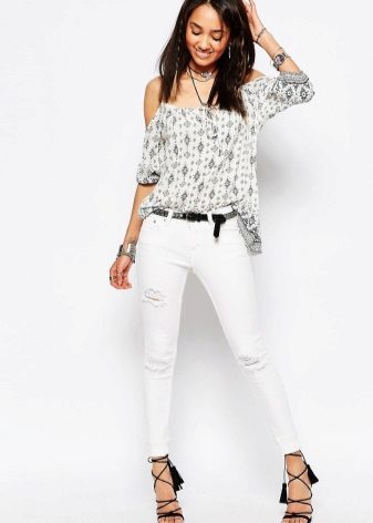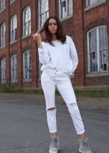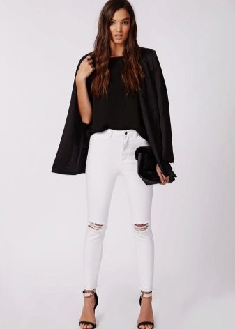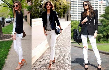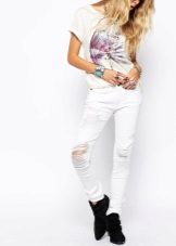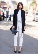 White jeans look good in a tandem with a black loose-fitting jacket and wide shoulders. When choosing tops and T-shirts, you should give preference to models decorated with symmetrical patterns in bright colors. Ripped white models can be combined with jackets or tops in military style.