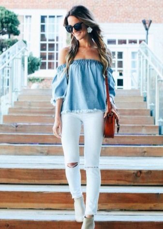 Ripped jeans should be worn with a simple cut denim shirt, as this season they are in trend. Looks good selection of the top and bottom in contrast. This outfit can even be worn to work, provided that there is no strict dress code. Shirt should be preferred in the spring season. Looks stylishly blue top, which is associated with the blue sky.