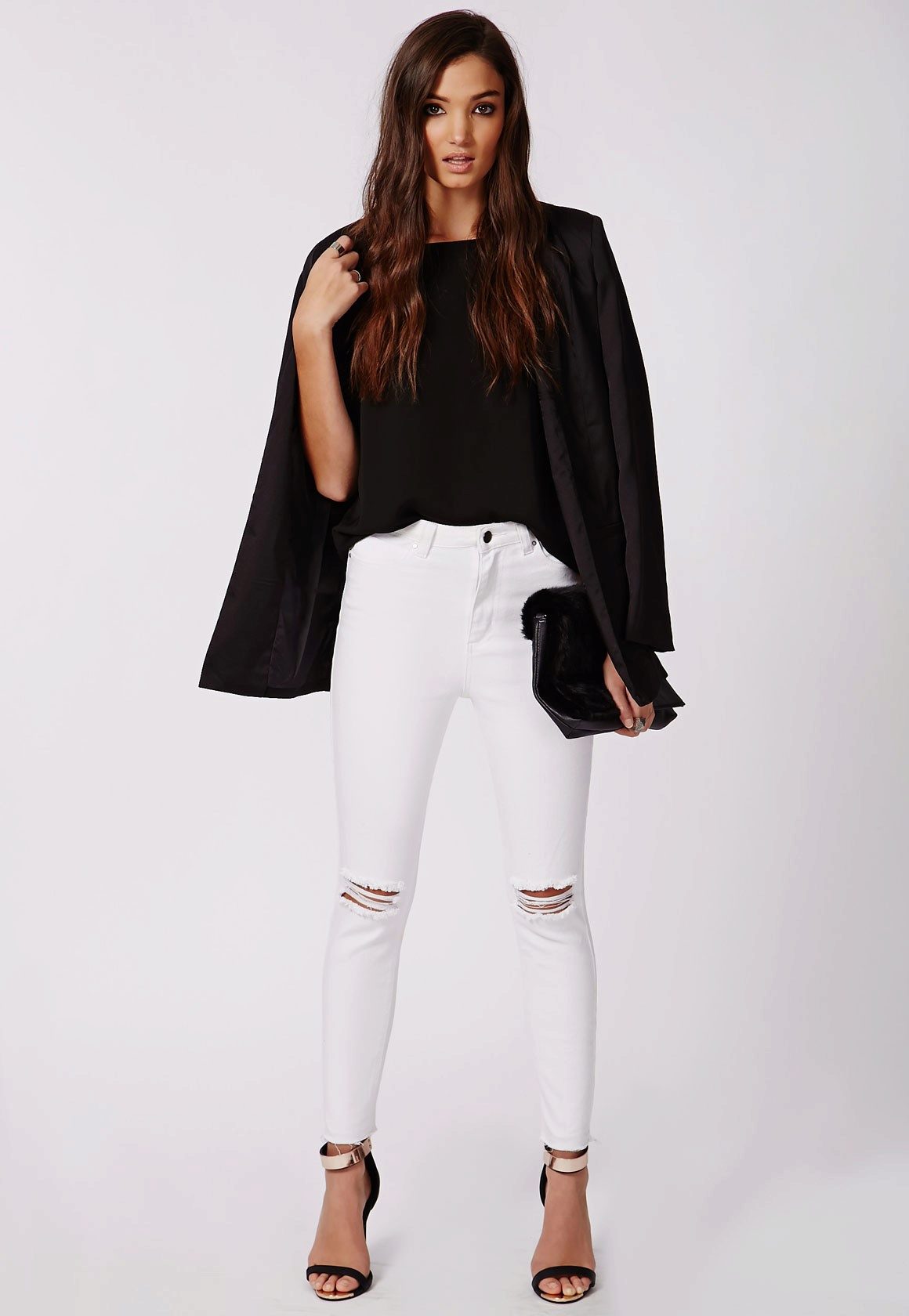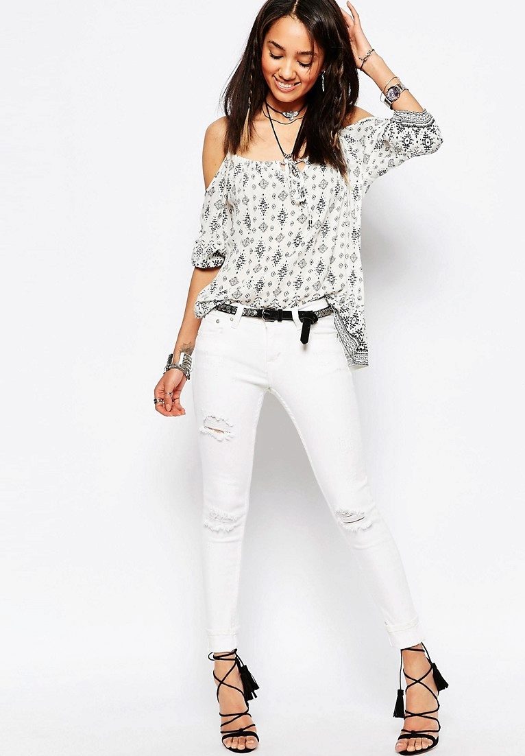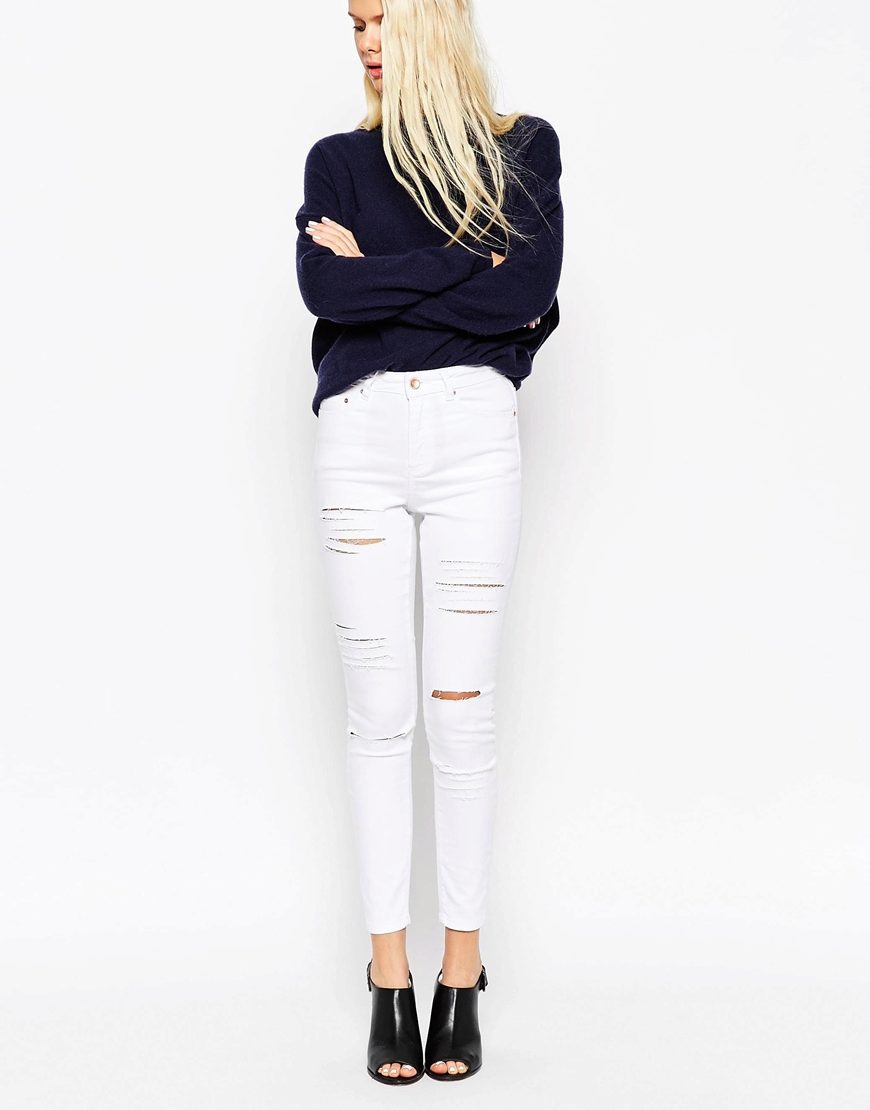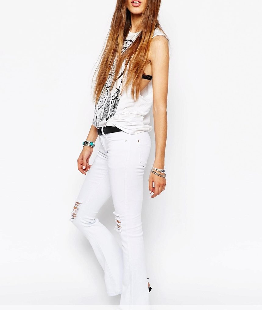 White ripped jeans have many advantages over other styles and colors. So, they will help to show the figure in a winning light, give the image of freshness, sexuality and style.