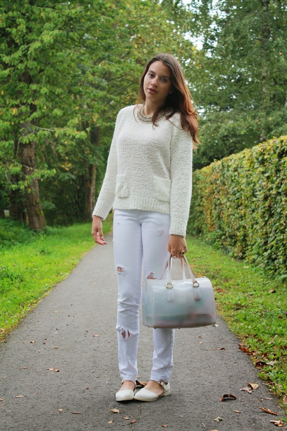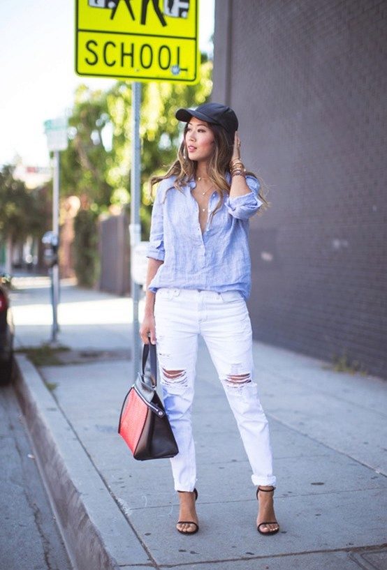 Today, every woman of fashion has stylish jeans in her wardrobe, and not just one pair in different colors. White jeans look elegant and beautiful, and the holes give them style. They fit perfectly in street style.