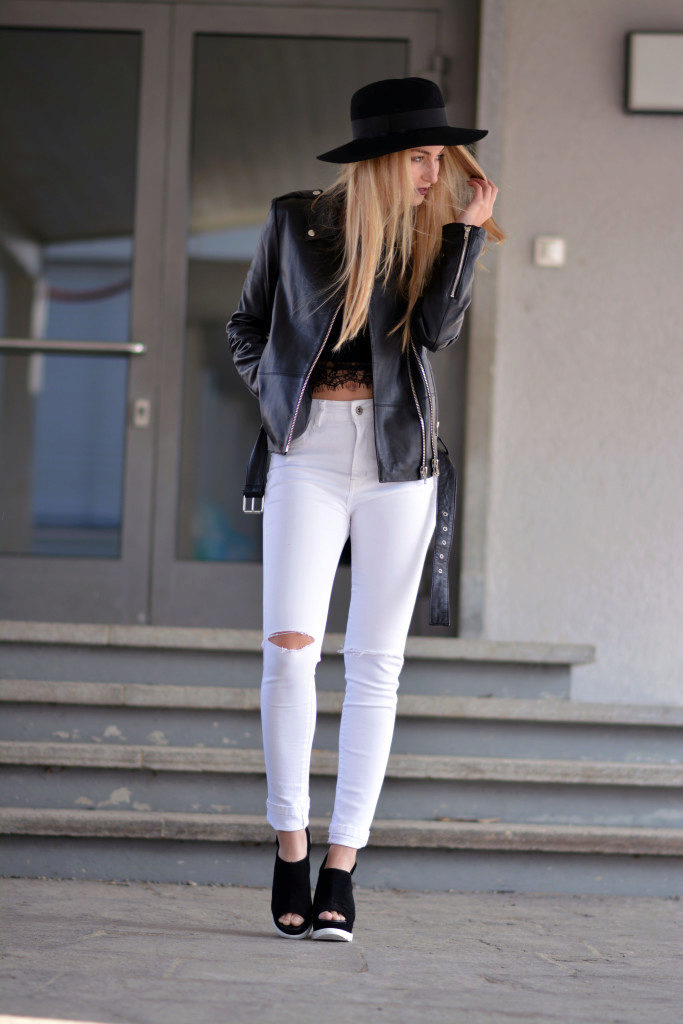 A striking look can be created with a combination of white skinny jeans, black leather jacket, gray t-shirt and studded boots. This bow is perfect for a walk or a party.