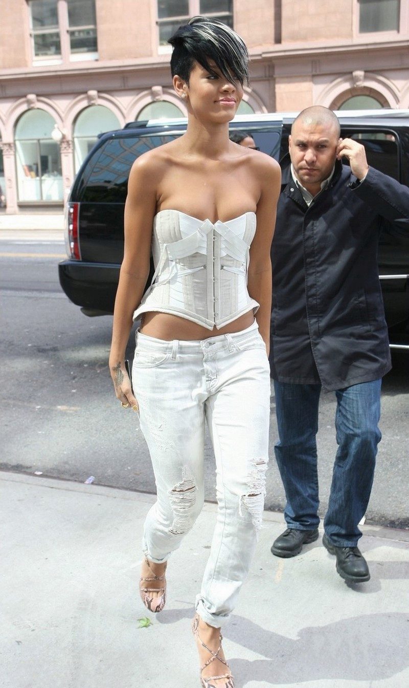 Ripped boyfriend jeans with a ruched top and ruffles, as well as high-heeled sandals will help show femininity.
