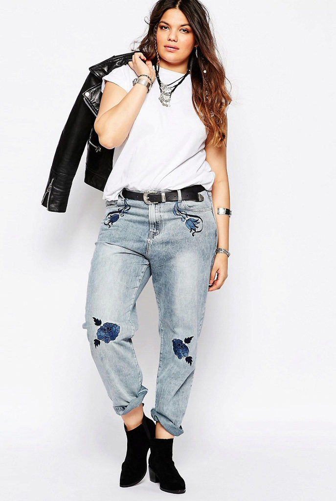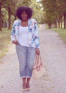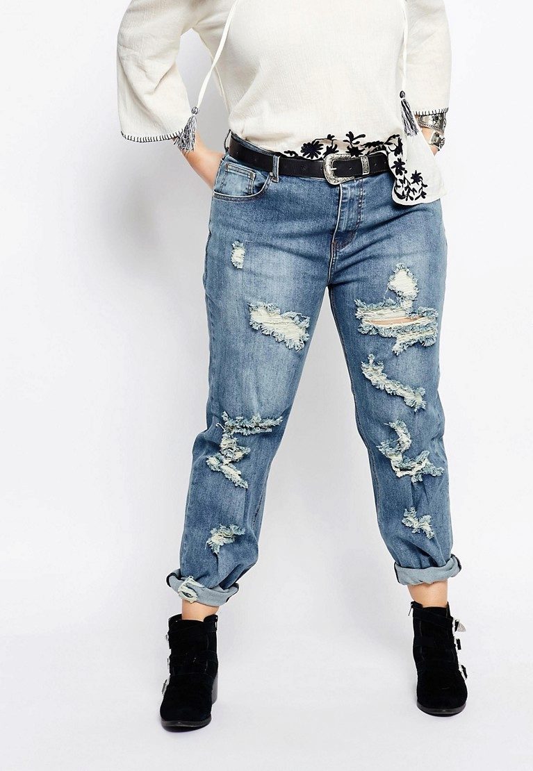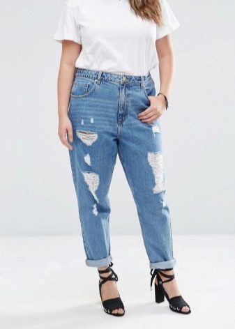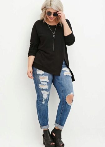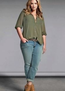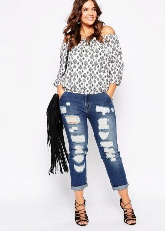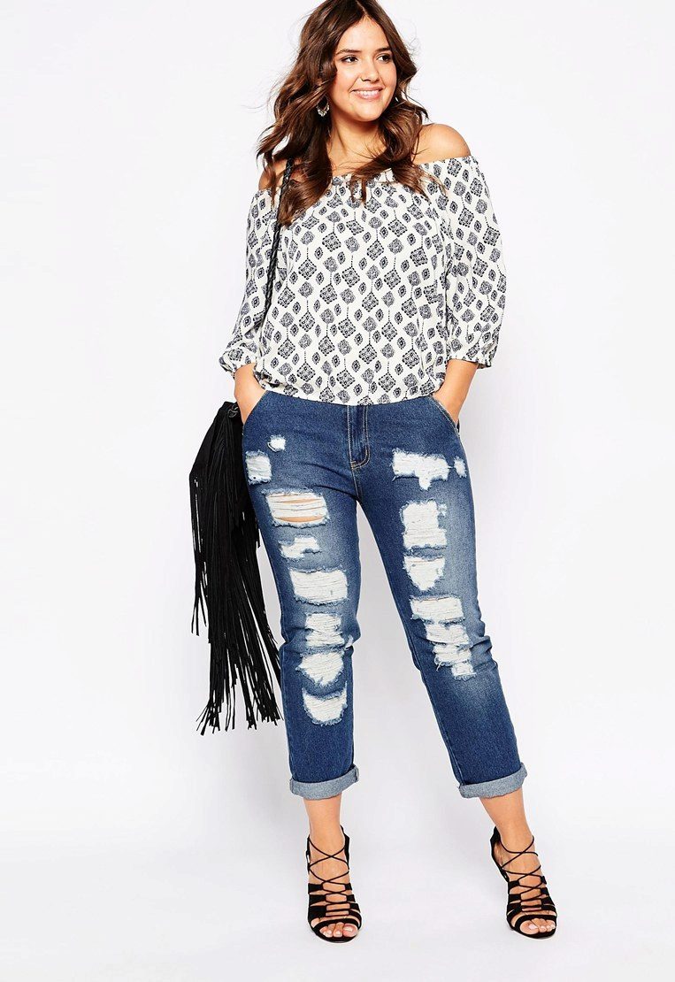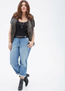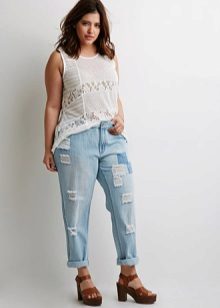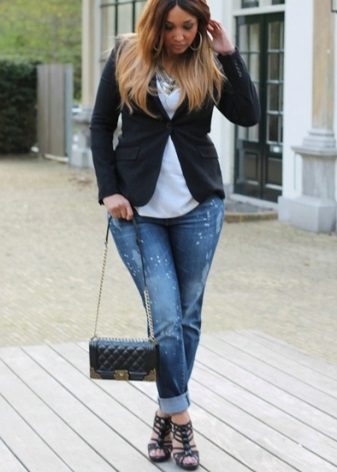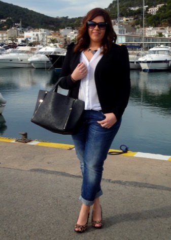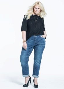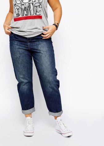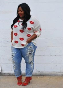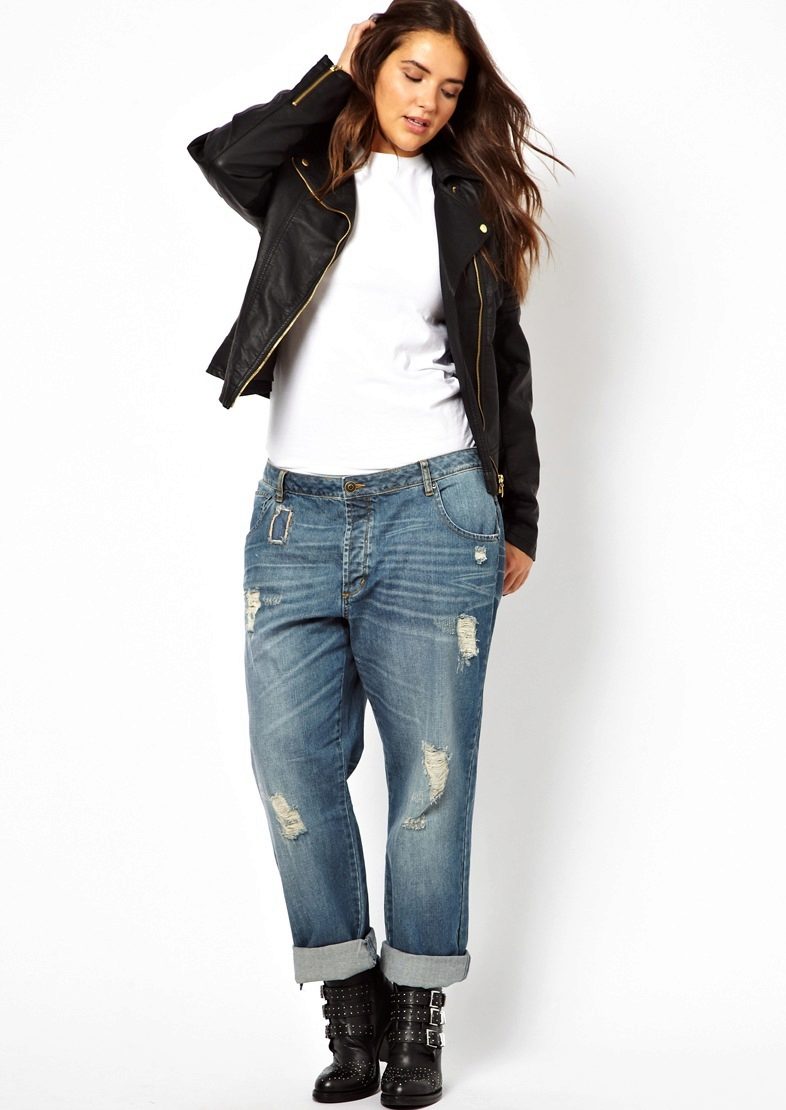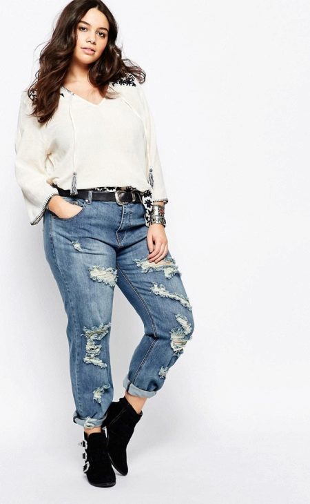 Girls with magnificent forms try to avoid voluminous clothing that fills them even more, but boyfriend jeans are an exception to the rule.
