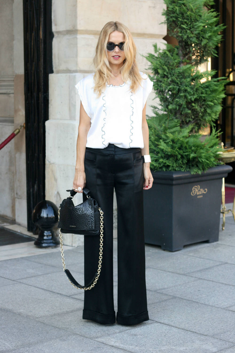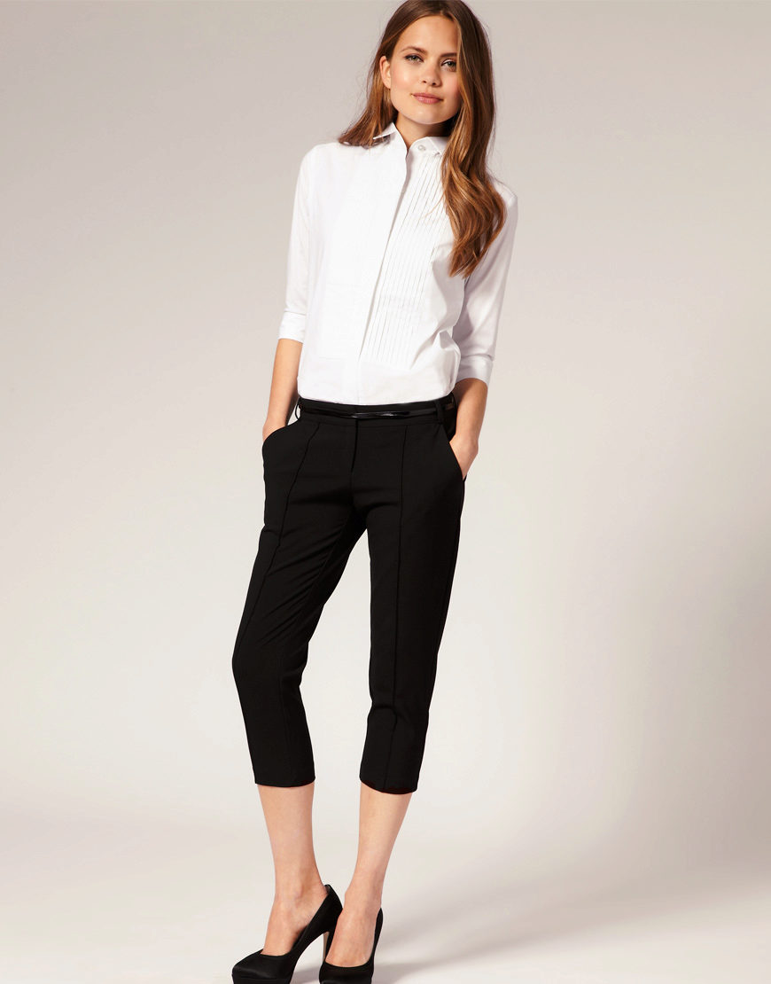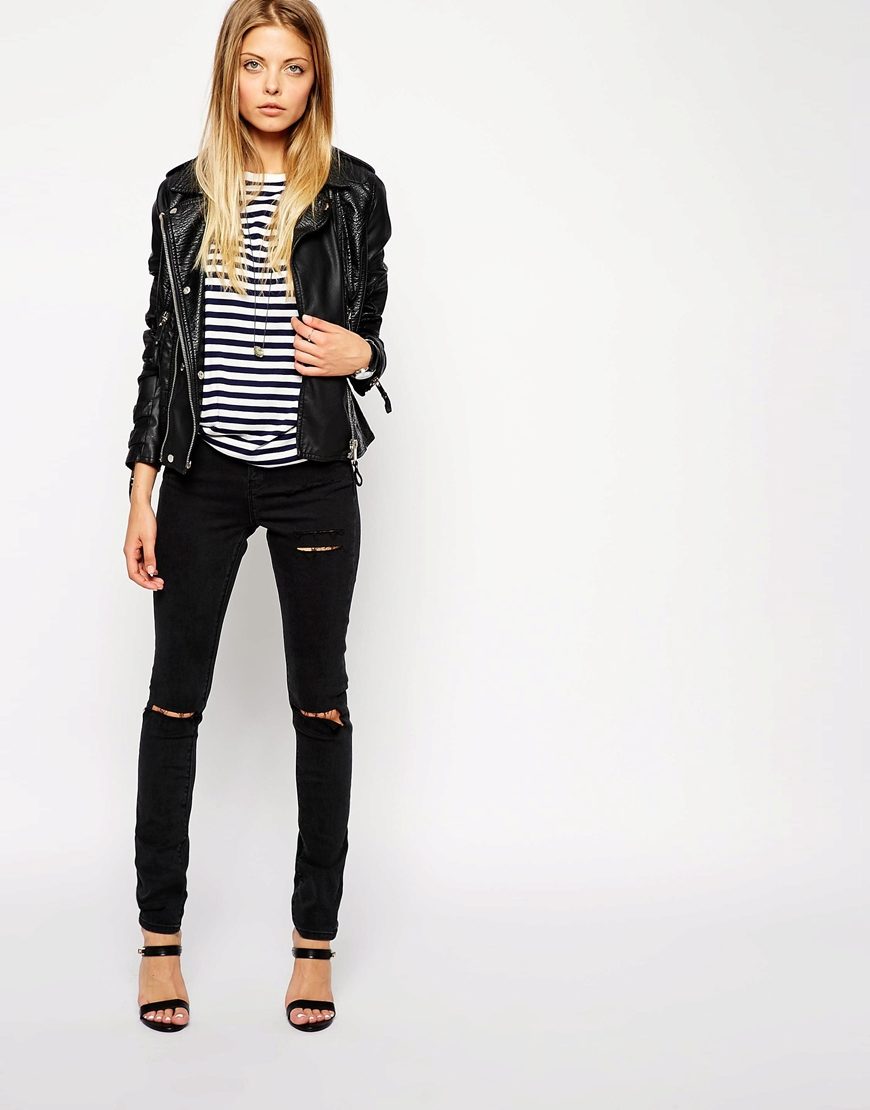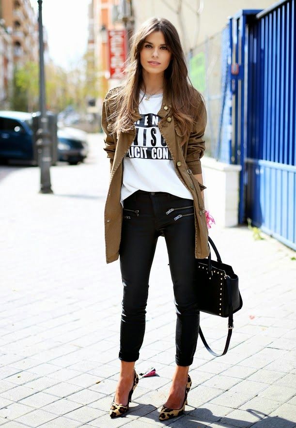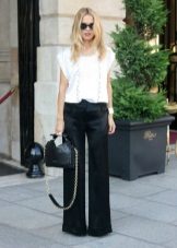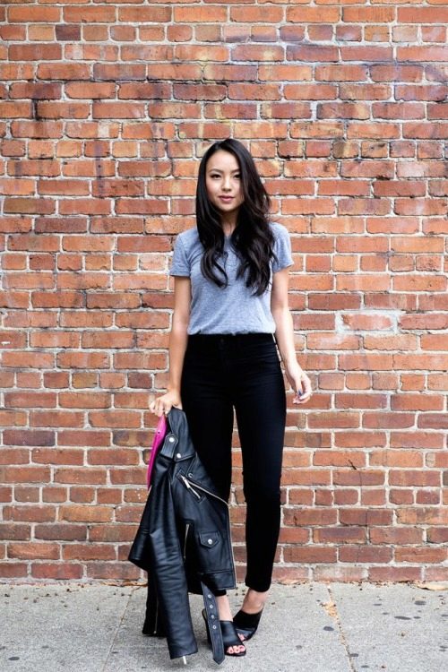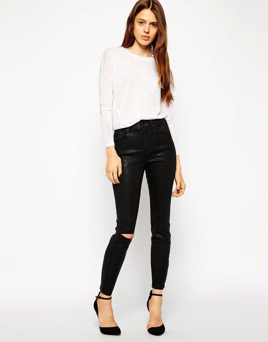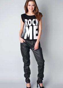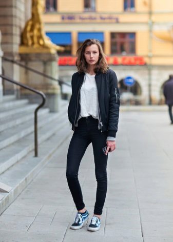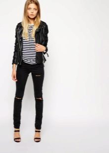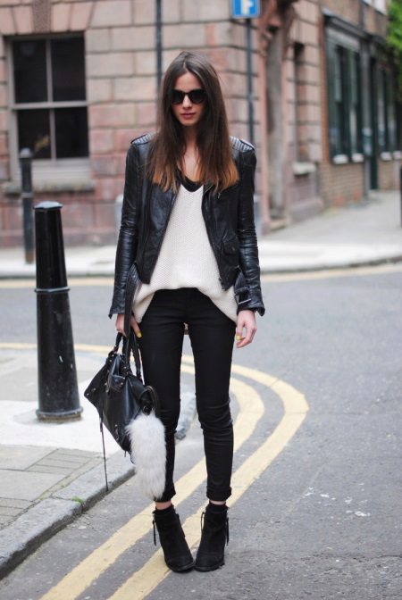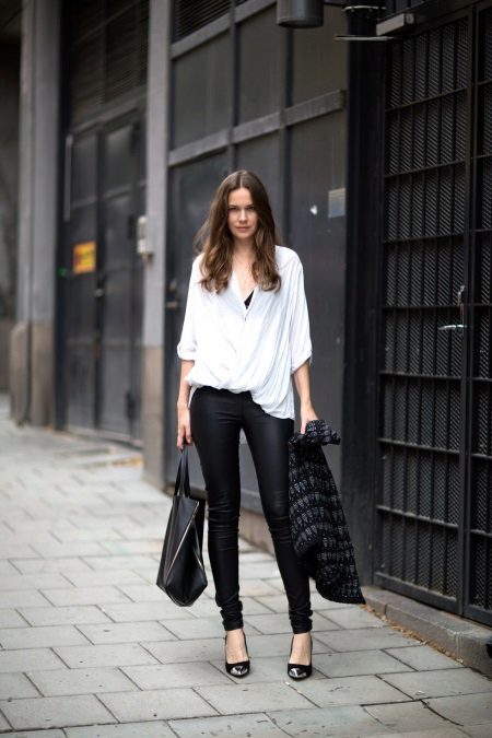 If you want to look fashionable and refresh your bow, then you should use your favorite combination of white and black. Black jeans look great in combination with a snow-white T-shirt, with which you should wear a jacket-leather jacket. The choice of shoes depends, of course, on the season, but high-heeled models are welcome.