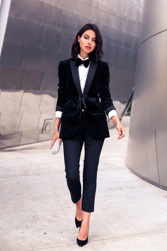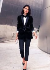 Black jeans are universal clothing, because they can be combined with almost all elements of the wardrobe. Black bottom with a white top looks very stylish, the contrast is the highlight of the image. With jeans you can wear a white shirt with a classic cut. On a cool day, you can add a stylish bow with a white jacket. The beautiful brooch with a large stone will become a beautiful decoration of the silhouette.