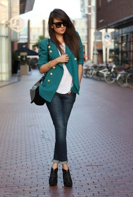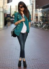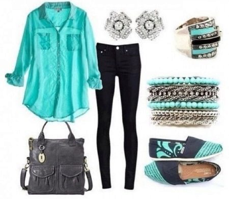 To create a glamorous, colorful look, a combination of black jeans and a turquoise blouse is suitable. The perfect complement will be decorations on the marine theme, as well as a roomy bag in tone with jeans.But the shoes can be both black and turquoise.