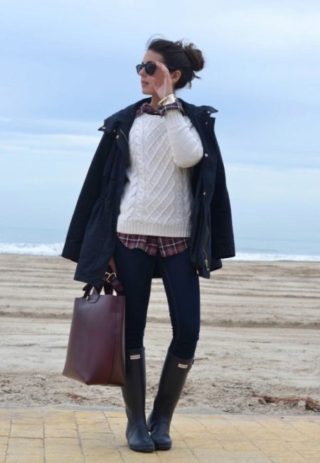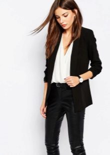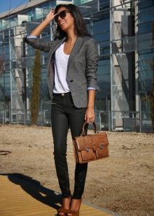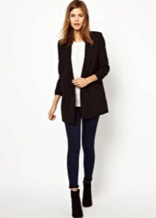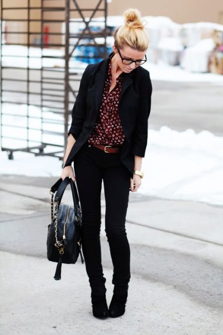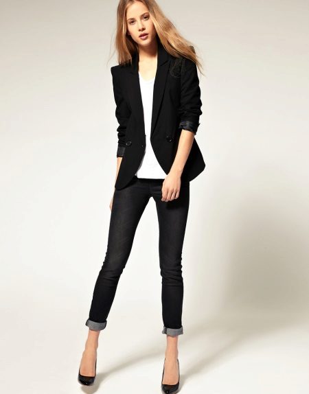 Black jeans look great in tandem with jackets both elongated and shortened. The first style will allow you to hide figure flaws, and the second will add elegance to office bow.