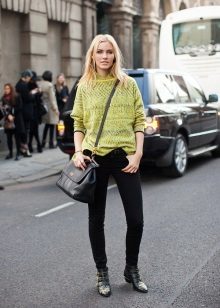 Black jeans with a turtleneck, cardigan or pullover are a beautiful tandem. To complement the unique image will help shoes on the platform, as well as exquisite accessories.