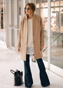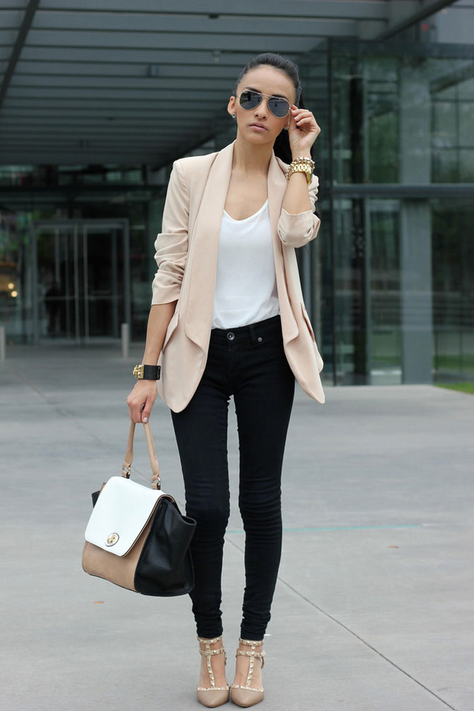 The combination of black jeans with a white blouse of the fitted cut and a black jacket of the shortened type looks very fashionable. When choosing the top, many fashionable women prefer a white T-shirt, over which you can wear a warm sand, coffee or beige cardigan.