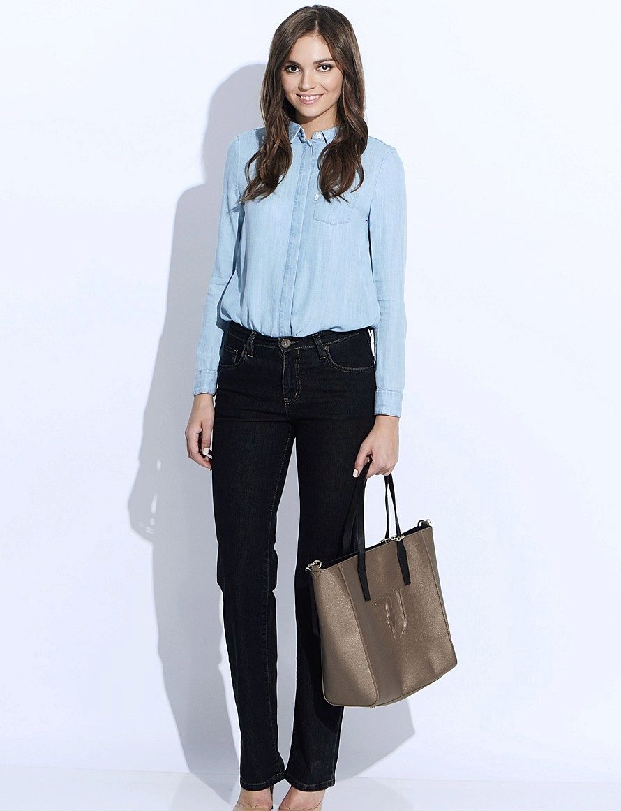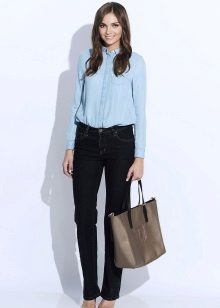 A stylish tandem is a combination of jeans with a blouse, decorated with a unique print, and a black jacket. But lovers of light colors will be able to create a romantic bow thanks to the combination of black jeans with a blue shirt, over which you can wear a white jumper.