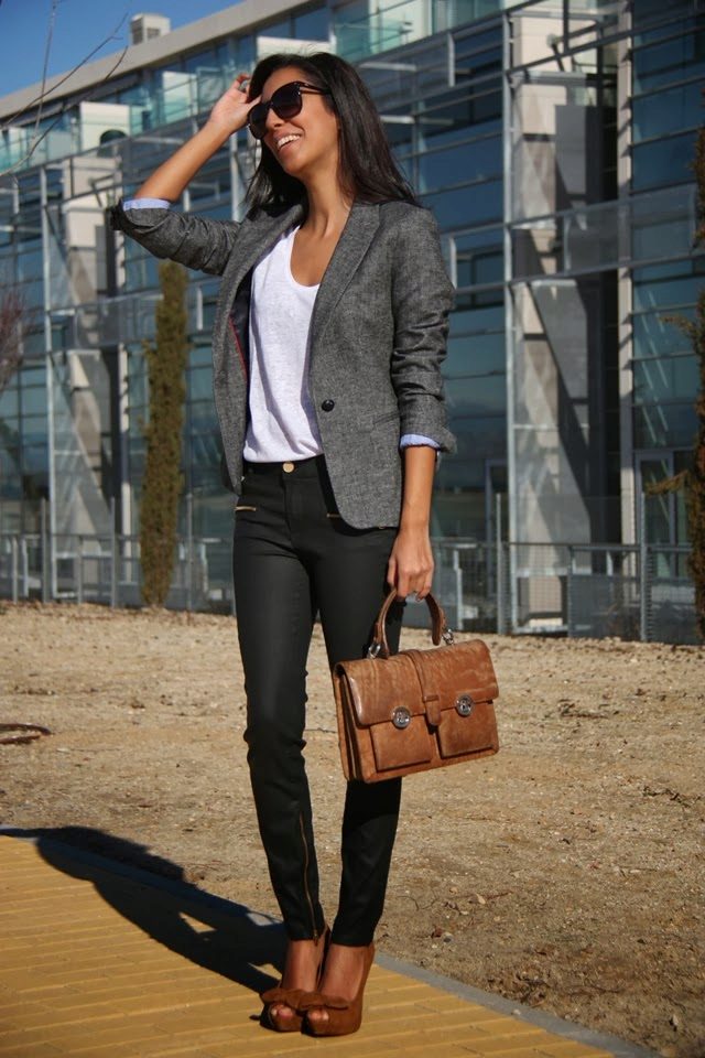 You can use black and white layering to create a casual look. Excellent looks jeans, boots with heels, leather jacket and black bag in combination with a white T-shirt and light accessories.