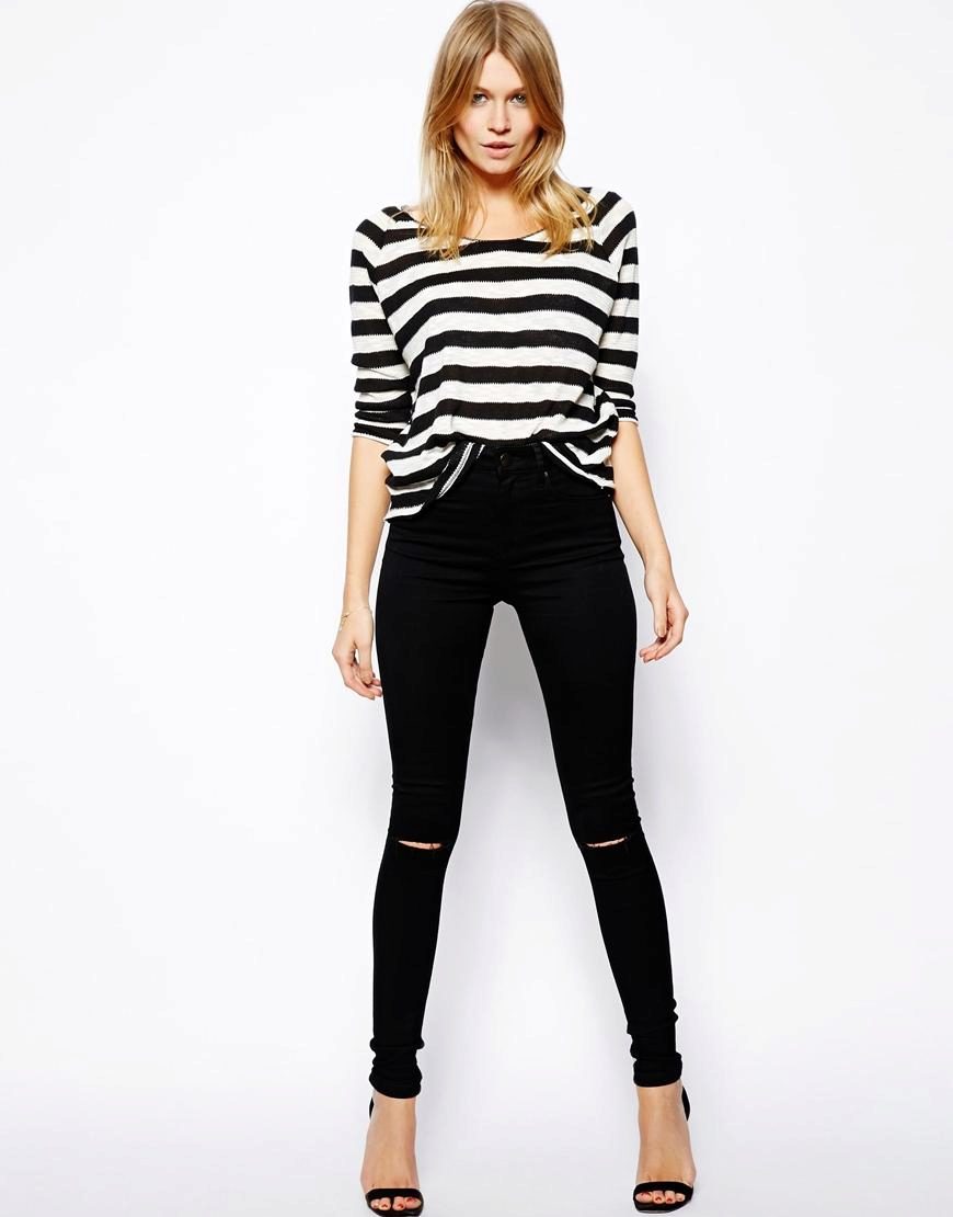Many girls prefer ragged jeans models that look fashionable and bright. To complement the unique bow will vest in black and white stripes and stiletto sandals.
