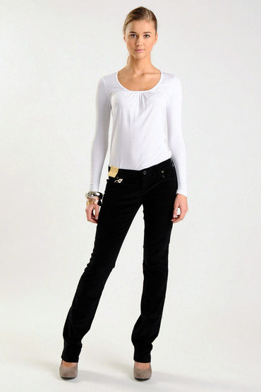 Black jeans straight cut are perfect for the embodiment of a business, elegant bow. They should be combined with elongated or shortened jackets. If the dress code allows, you can give the image of appeal through a vest or blouse, decorated with rhombus of a contrasting color.