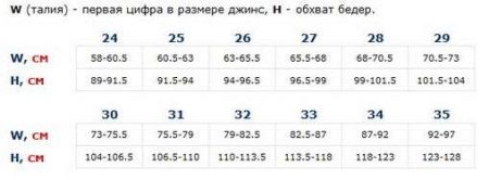 The company offers models from 25 to 34 sizes. To pick it up correctly, it is necessary to measure the waist and hips circumference.