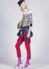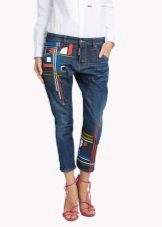 - Dark blue mid-rise cropped jeans. In these trousers, you definitely will not go unnoticed, thanks to the original decor in the form of a bright contrasting application.