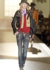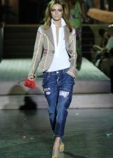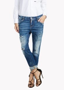 - Straight blue jeans with a classic fit at the waist look very modern, due to the effect of wear and tears on the pants.