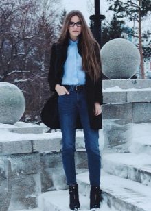- With a high waist. Another name for such models is mom-jeans. These jeans are presented in the classic colors: blue, black and blue. Also on high-waisted jeans can be prints. They can be narrowed to the bottom, with scuffs or tears. Such models are better to wear with thin blouses or T-shirts tucked into jeans.